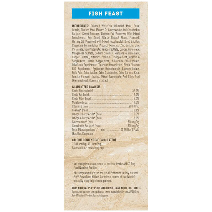 Only Natural Pet PowerFood Fish Feast Grain Free Dog Food is a dry dog food made with whitefish, whitefish meal, chicken meal, real vegetables, and fruit. These ingredients combine for a nutritious, holistically balanced, high protein diet that is complete and balanced for adult dogs.