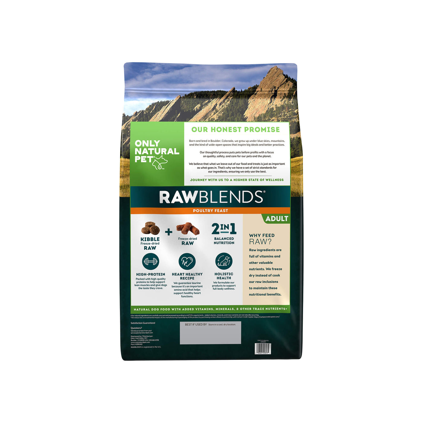 Only Natural Pet Raw Blends Chicken & Poultry Feast is s high-quality, grain-free dry dog food combined with delicious, nutritious freeze-dried bites. Featuring high protein chicken and turkey with freeze-dried raw superfoods, it supports your dog's overall health and wellness, making it a perfect choice for discerning pet parents.