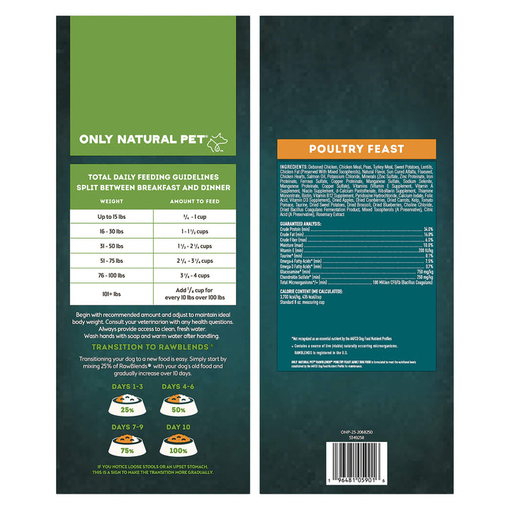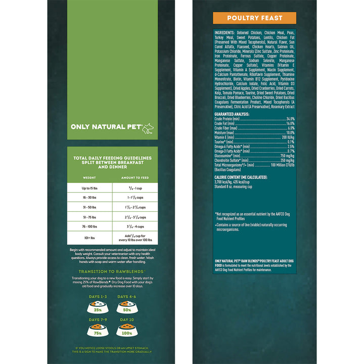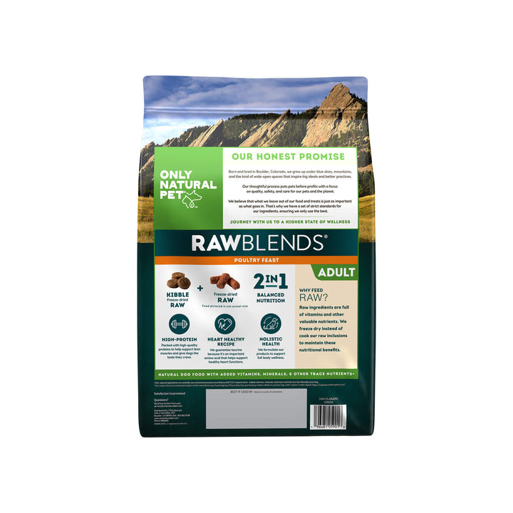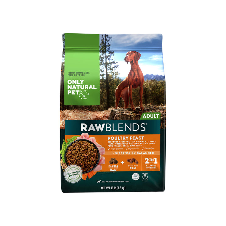 Only Natural Pet Raw Blends Chicken & Poultry Feast is s high-quality, grain-free dry dog food combined with delicious, nutritious freeze-dried bites. Featuring high protein chicken and turkey with freeze-dried raw superfoods, it supports your dog's overall health and wellness, making it a perfect choice for discerning pet parents.