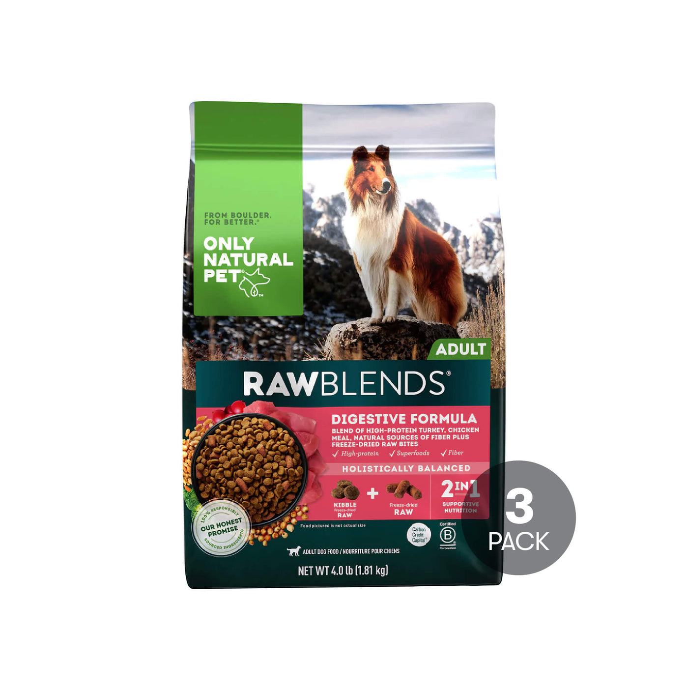 Only Natural Pet RawBlends Digestive Care Dog Food for Sensitive Stomachs is a holistically balanced grain-in functional diet that blends high-protein turkey, chicken meal, and nutritious vegetables and fruits with freeze-dried raw superfood bites, all in an easy-to-feed sensitive stomach dog food. Packed with high-quality proteins to help support lean muscles, and fiber-rich ancient grains, like barley, rye, and millet, this raw inclusion kibble is holistic health formulated to support full-body wellness. Sensitive stomach dog food, enriched with beneficial fiber and Omega-3 Fatty Acids, soothes and improves your dog's digestion. Our freeze-dried raw inclusions are full of vitamins and valuable nutrients. By freeze-drying instead of cooking, the raw inclusions in this sensitive stomach dog food maintain their nutritional benefits, helping your dog thrive. These superfood bites are not only nutritious but also support your dog's digestion!
