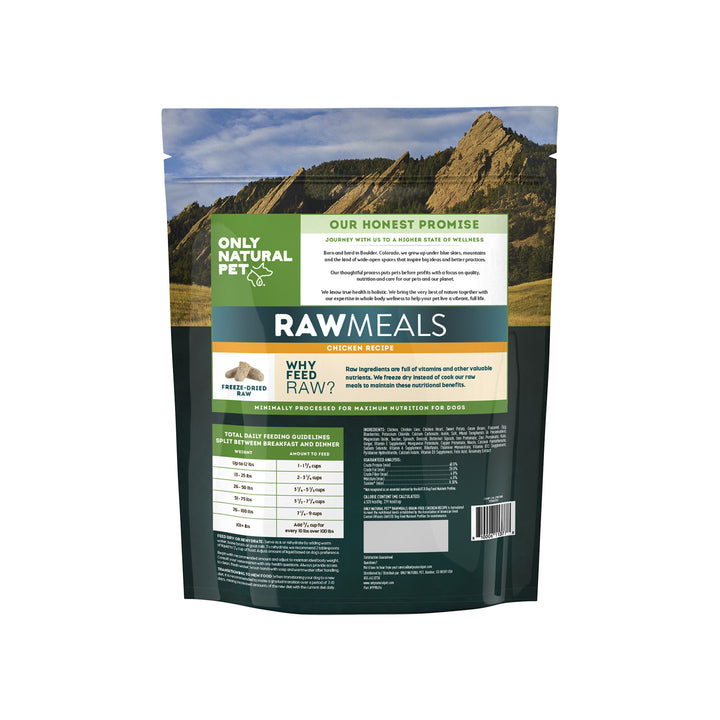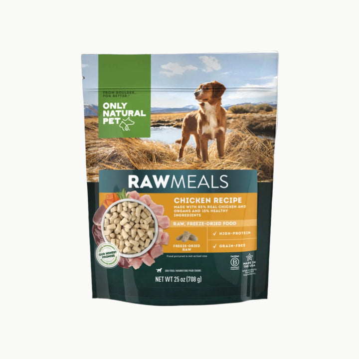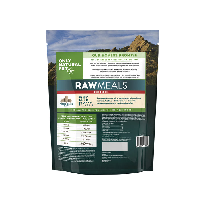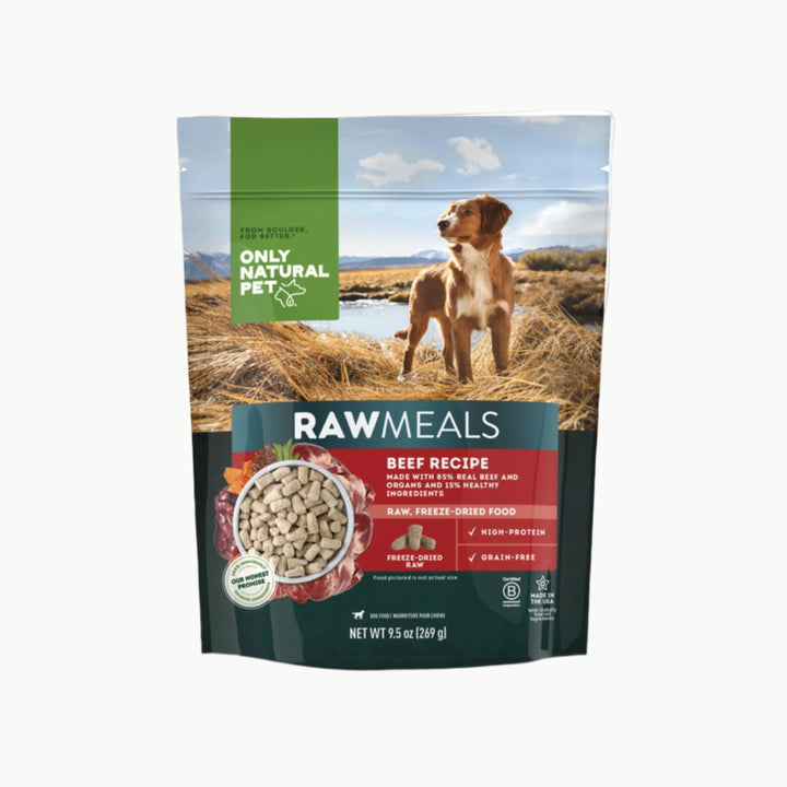 Only Natural Pet RawMeals delivers the protein-packed raw nutrition your dog craves—without the mess of traditional raw feeding. This minimally processed freeze-dried dog food is crafted with real meat (beef or chicken) and fresh vegetables, then rapidly frozen to preserve nutrients and flavor. The result is a shelf-stable, safe, and easy-to-serve meal that satisfies your dog’s instincts and your need for convenience.
