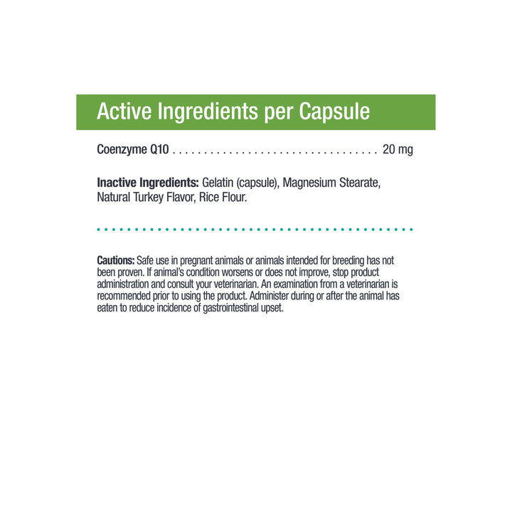 Coenzyme Q10, also known as ubiquinone, is essential for energy production at the cellular level. It helps the body produce energy both by helping to create the enzymes the cell uses to create ATP and by creating energy directly. It is also an antioxidant. It has been shown to benefit pets with various heart and muscle diseases.