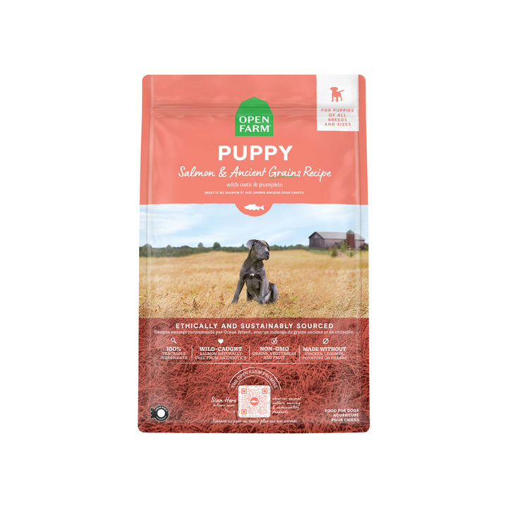 This high-protein Open Farm puppy dry dog food helps prevent allergies and supports DHA healthy brain development. It features a blend of humanely raised chicken, pork, fresh Pacific wild-caught salmon, and wholesome ancient grains.