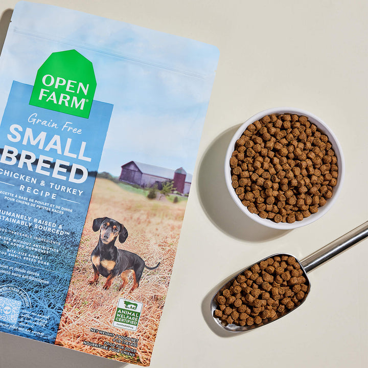 Open Farm Grain Free Small Breed Dry Dog Food Thanks to a high-protein blend of ethically raised chicken and turkey, as well as useful nutrients like chicory root and green lipped mussel, this nutrient-dense kibble was designed for smaller breeds' higher metabolic rates.