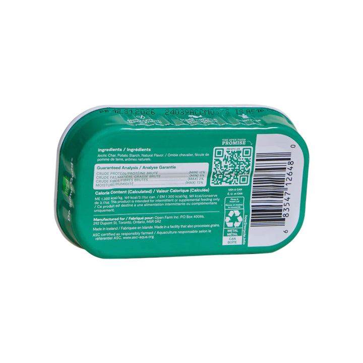 Fresh Icelandic Arctic char offers a mild, slightly sweet flavor in a silky mousse texture, perfect for cats who enjoy a gentle seafood profile.Country of origin: USAManufacturer: Open Farm - Ingredients