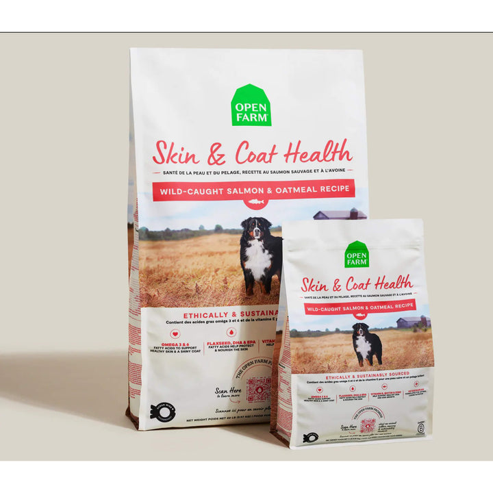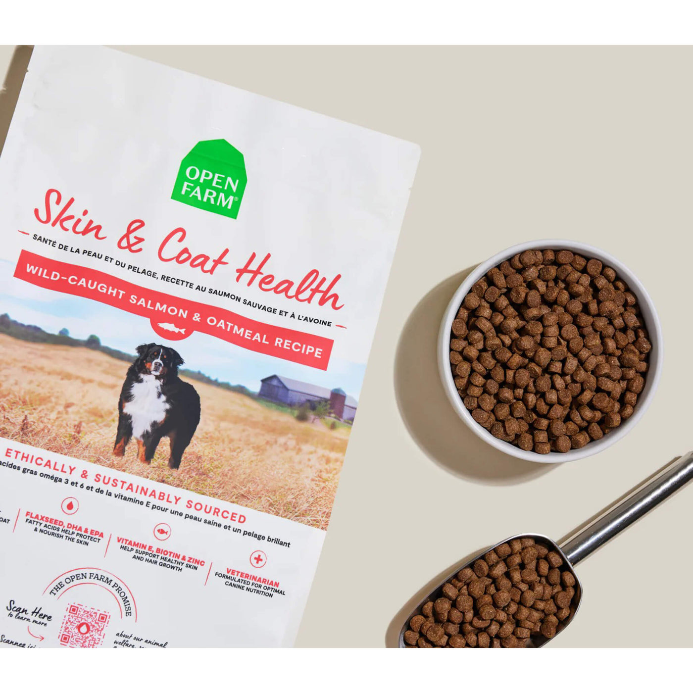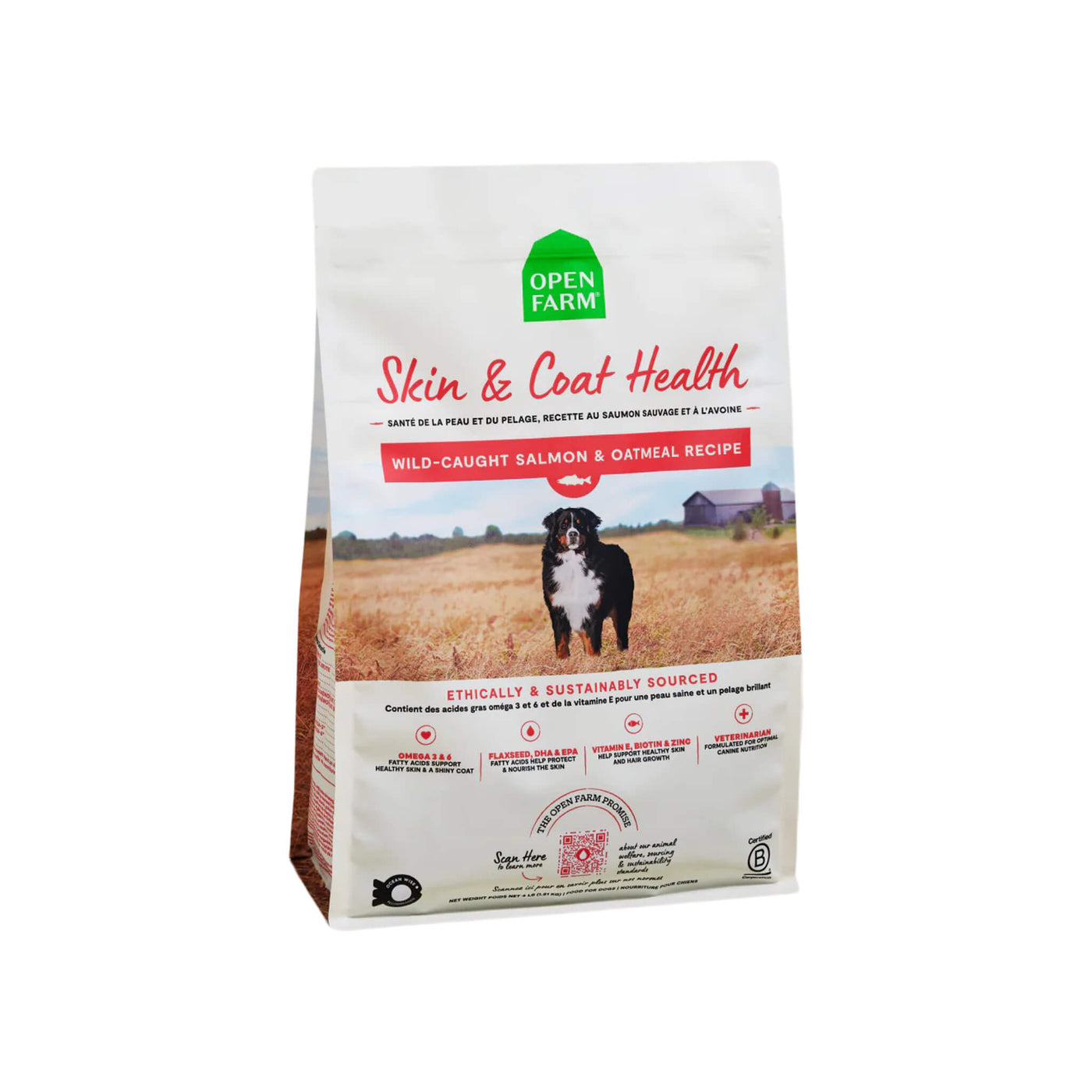 Open Farm Skin & Coat Health Salmon & Oatmeal Dry Dog Food is a functional dog food for healthy skin and coat made with wild-caught salmon and wholesome grains. This vet-formulated recipe delivers complete and balanced nutrition with omega fatty acids to support skin hydration and a glossy coat.