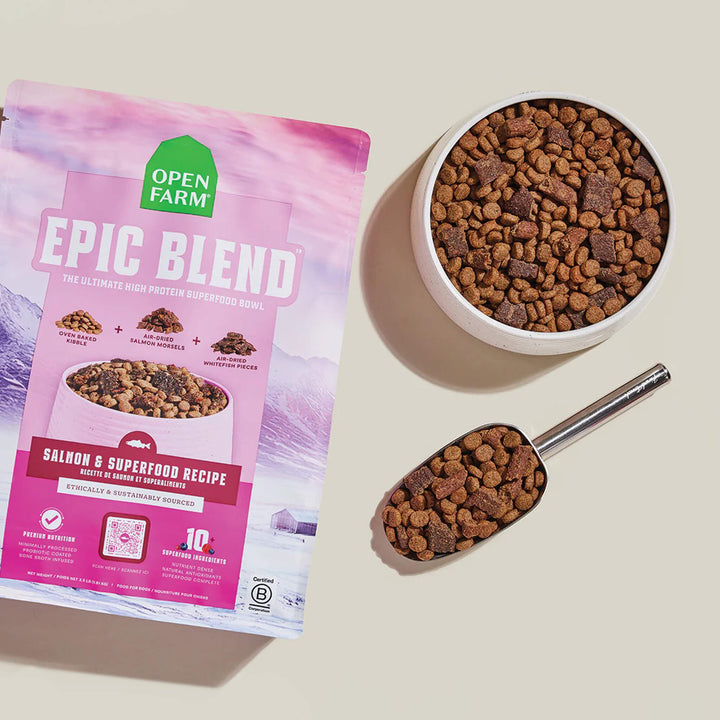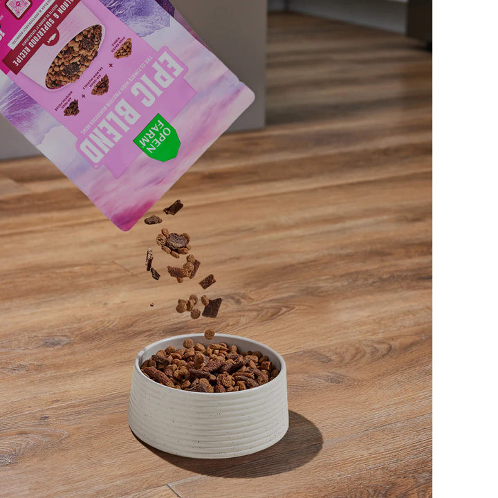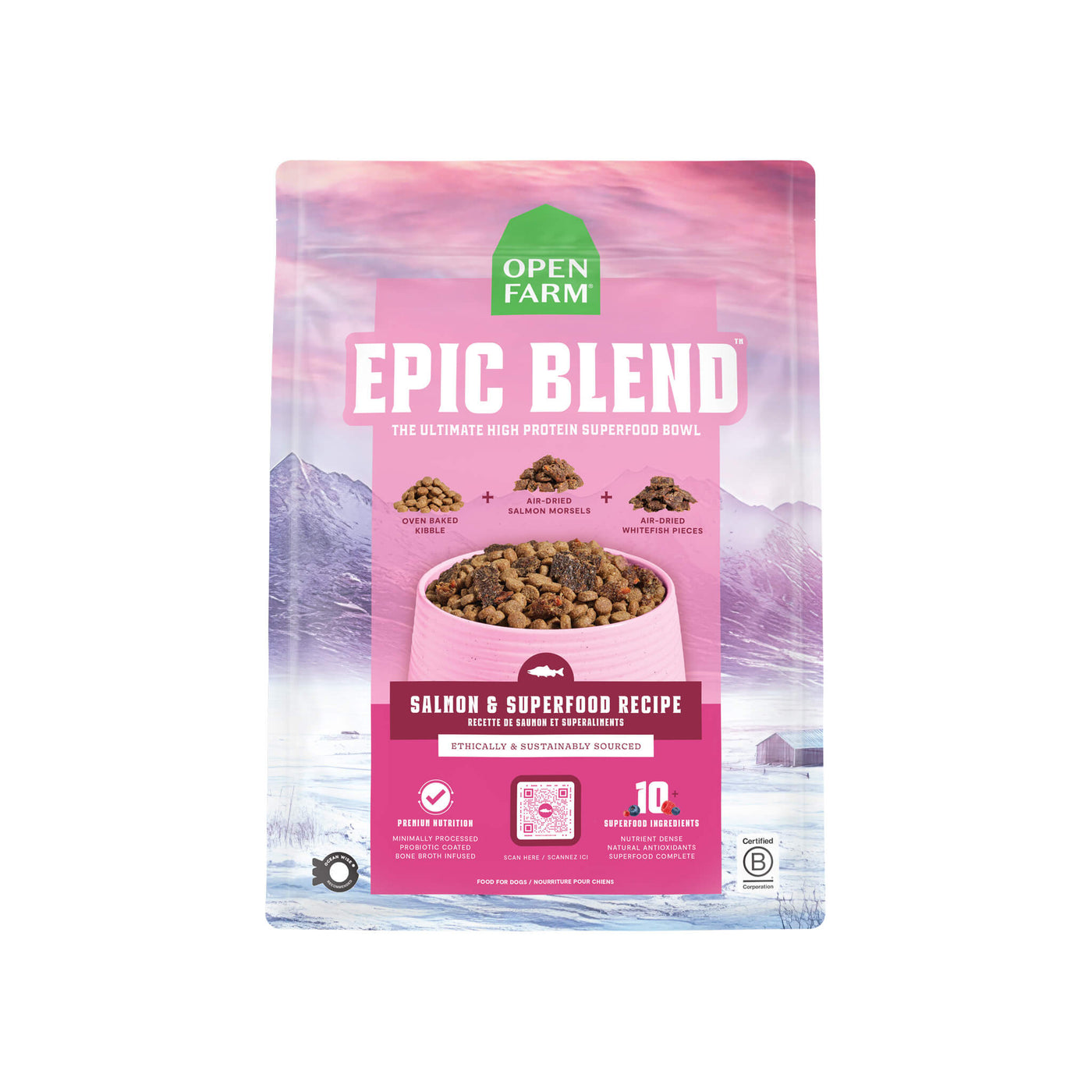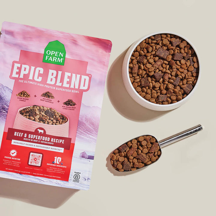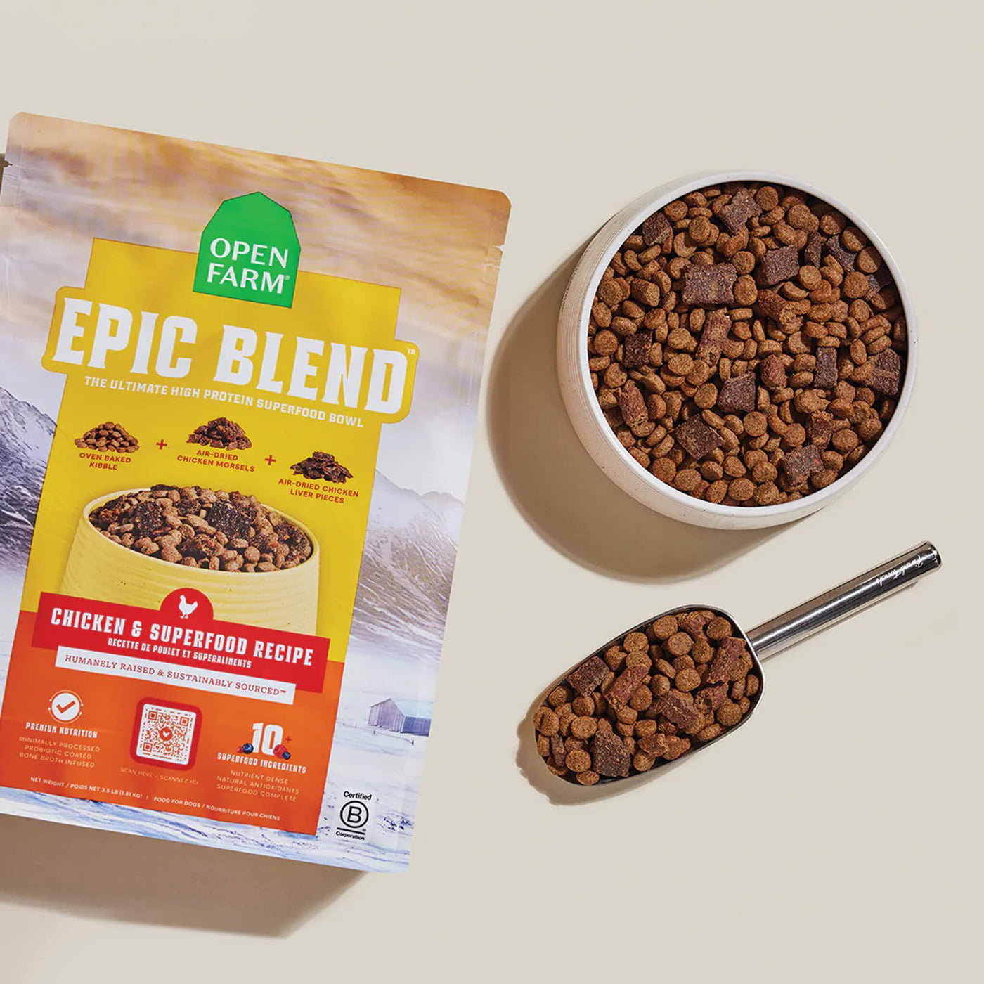 Upgrade your dog’s diet with Open Farm Epic Blend Dry Dog Food with Superfoods—wholesome, flavorful nutrition crafted with care.
