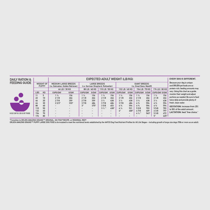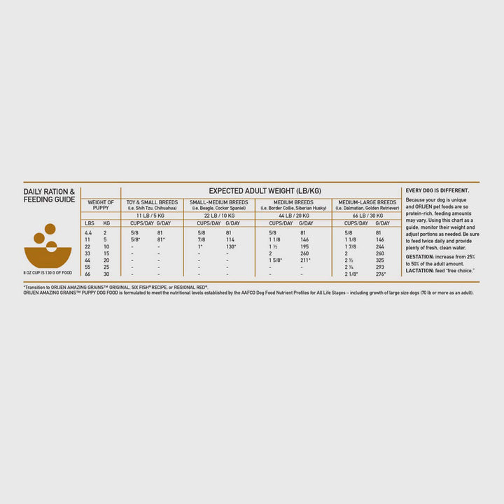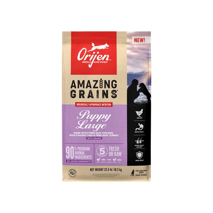 Available for puppies of all sizes, try Orijen Amazing Grains Dry Puppy Food today!