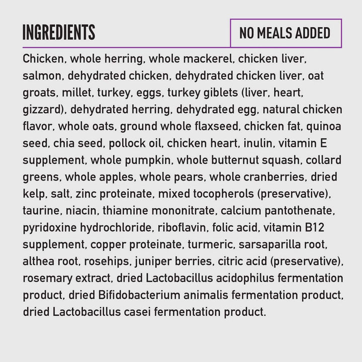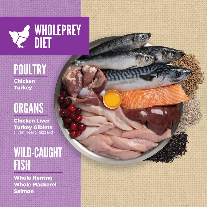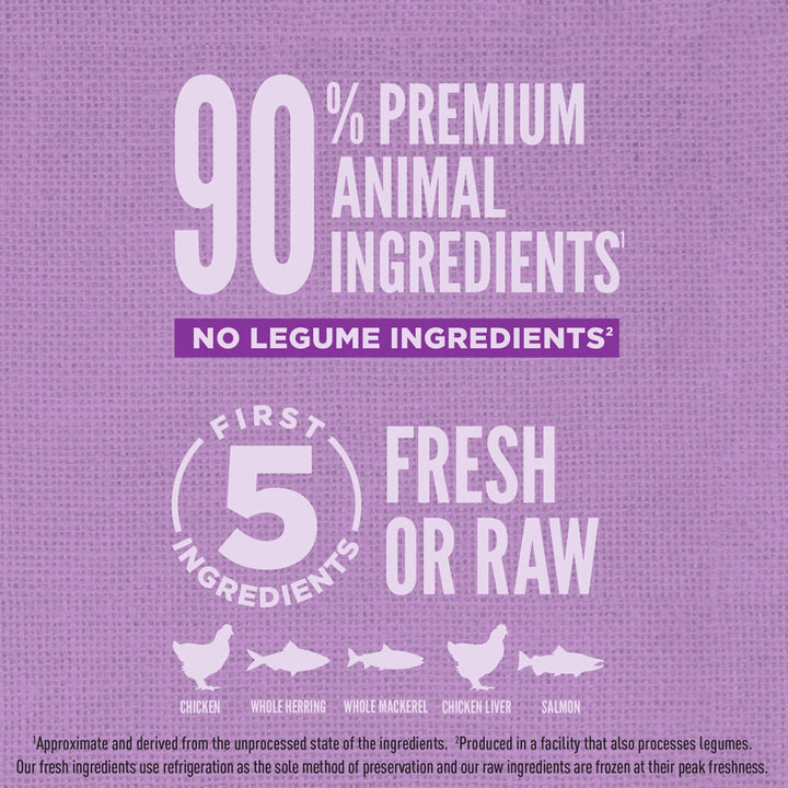 Composed of 90% premium animal ingredients, including free-run chicken and turkey, and wild-caught fish, providing essential proteins, vitamins, and minerals