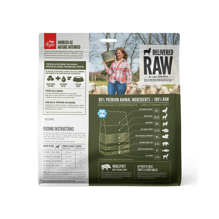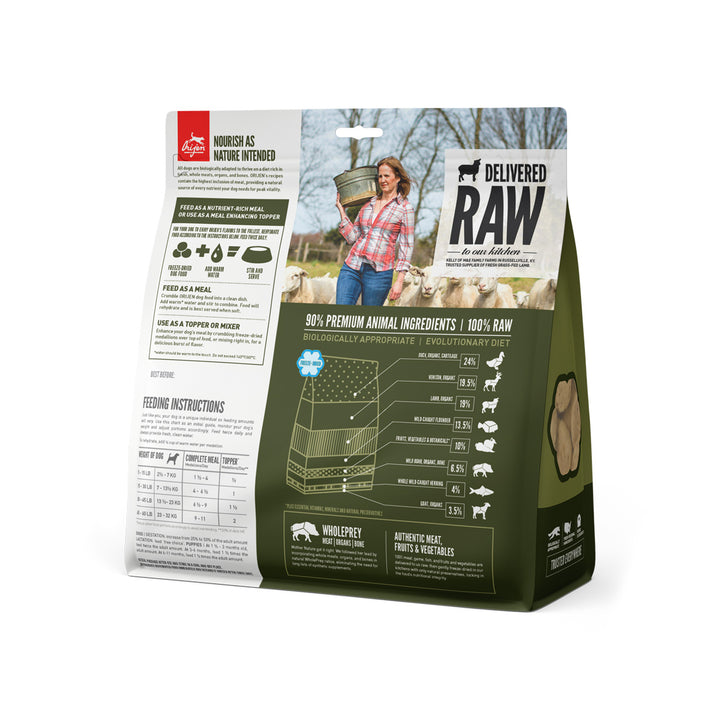 Orijen Grain-Free Freeze-Dried Dog Food biologically appropriate meals are specially formulated to give your dog a nourishing diet inline with his wolf ancestry. As a carnivore, your dog is adapted to thrive on a variety of foods, including fresh, whole prey, and supplemental berries, fruits, and grasses. That's why Orijen created their freeze-dried meals with the finest, Canadian sourced ingredients, using whole prey meats (including quality meats & organs).