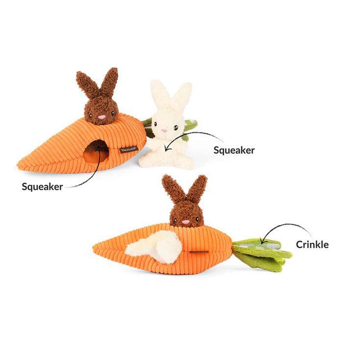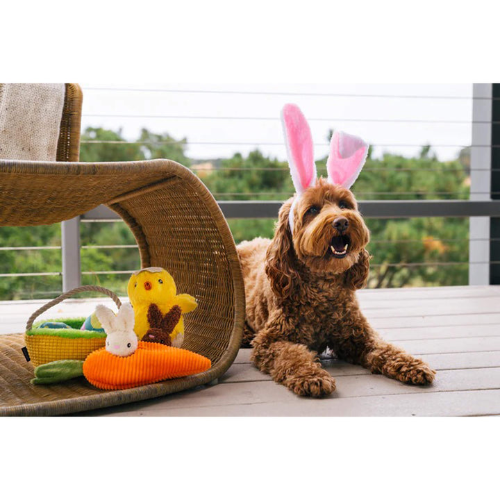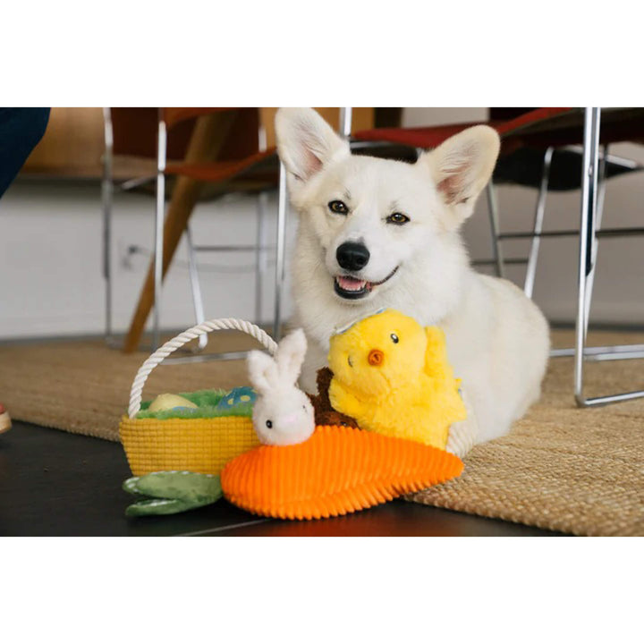 P.L.A.Y. Hippity Hoppity Collection Dog Toys are Easter dog toys designed to bring springtime joy to your pup’s playtime. Featuring festive favorites like a crinkly carrot filled with Funny Bunnies, a plush Egg-cellent Basket, and a squeaky chick, this collection is perfect for celebrating the season.