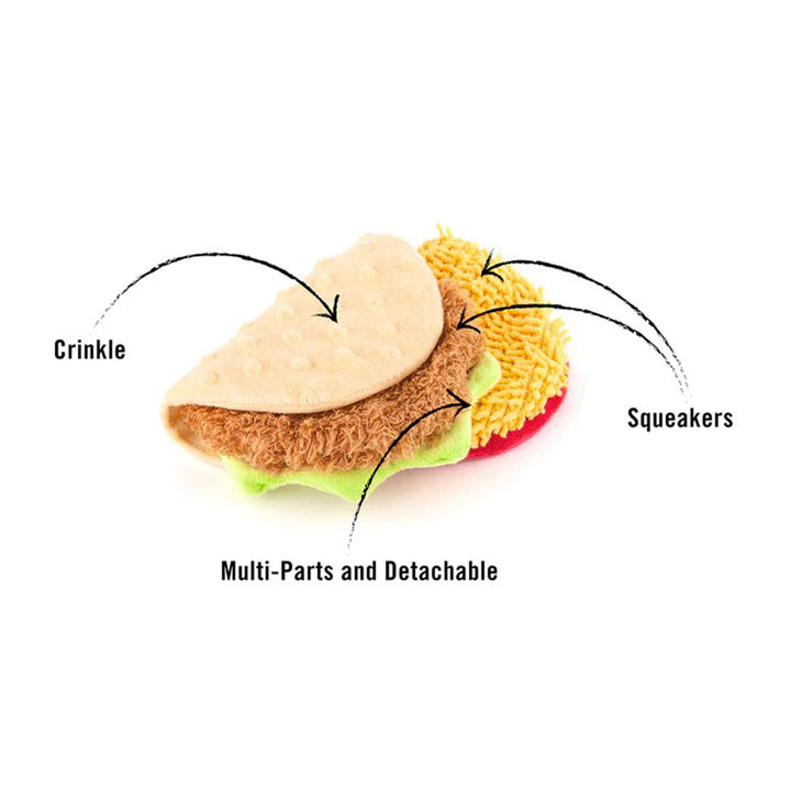 Made with eco-friendly PlanetFill® from recycled plastic bottles, P.L.A.Y. International Classics Dog Toys are hand-crafted with reinforced stitching and meet infant toy safety standards. The taco dog toy features detachable crinkly shells and squeaky fillings for interactive enrichment.
