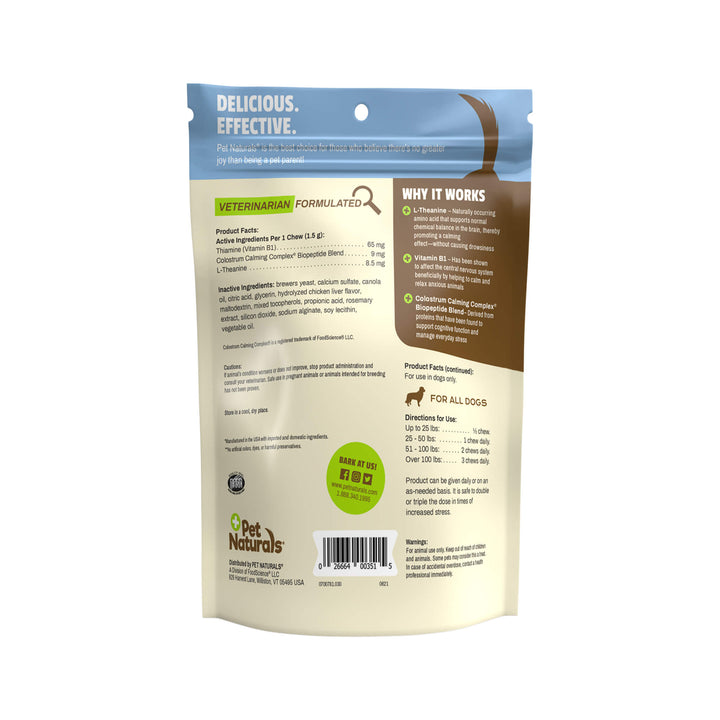 Pet Naturals Calming Soft Chews for Dogs help alleviate stress related behavior problems without affecting your dog's personality or energy level. It can be used daily or when extra help to relax is needed. It contains a unique combination of ingredients such as a Colostrum Calming Complex, L-Theanine and Thiamine (Vitamin B1) which all address stress and calming.