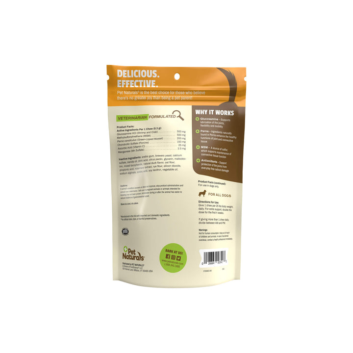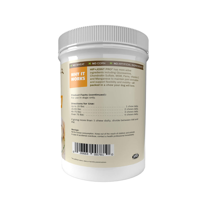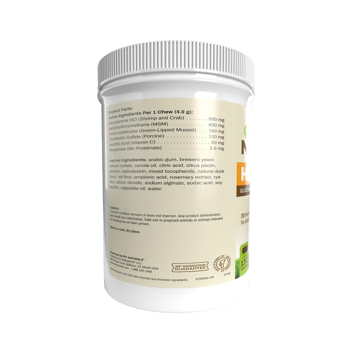 Pet Naturals Hip + Joint PRO is a unique formulation that enhances flexibility and mobility with natural ingredients like glucosamine, chondroitin, Perna, DMG, MSM, Manganese, and Vitamin C. These naturally occurring substances maintain joint lubrication and support healthy joint function, as well as promote immune health, inflammatory response, and bladder and urinary tract health.