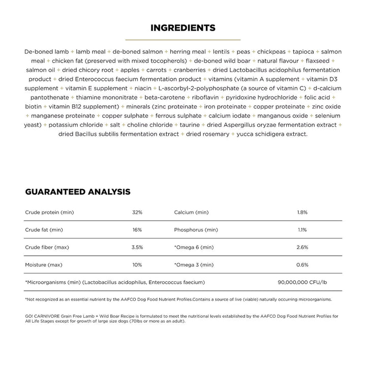 This hearty blend of succulent lamb and wild boar delivers a robust, game-inspired flavor for adventurous eaters.Country of origin: CanadaManufacturer: Petcurean - Ingredients