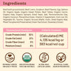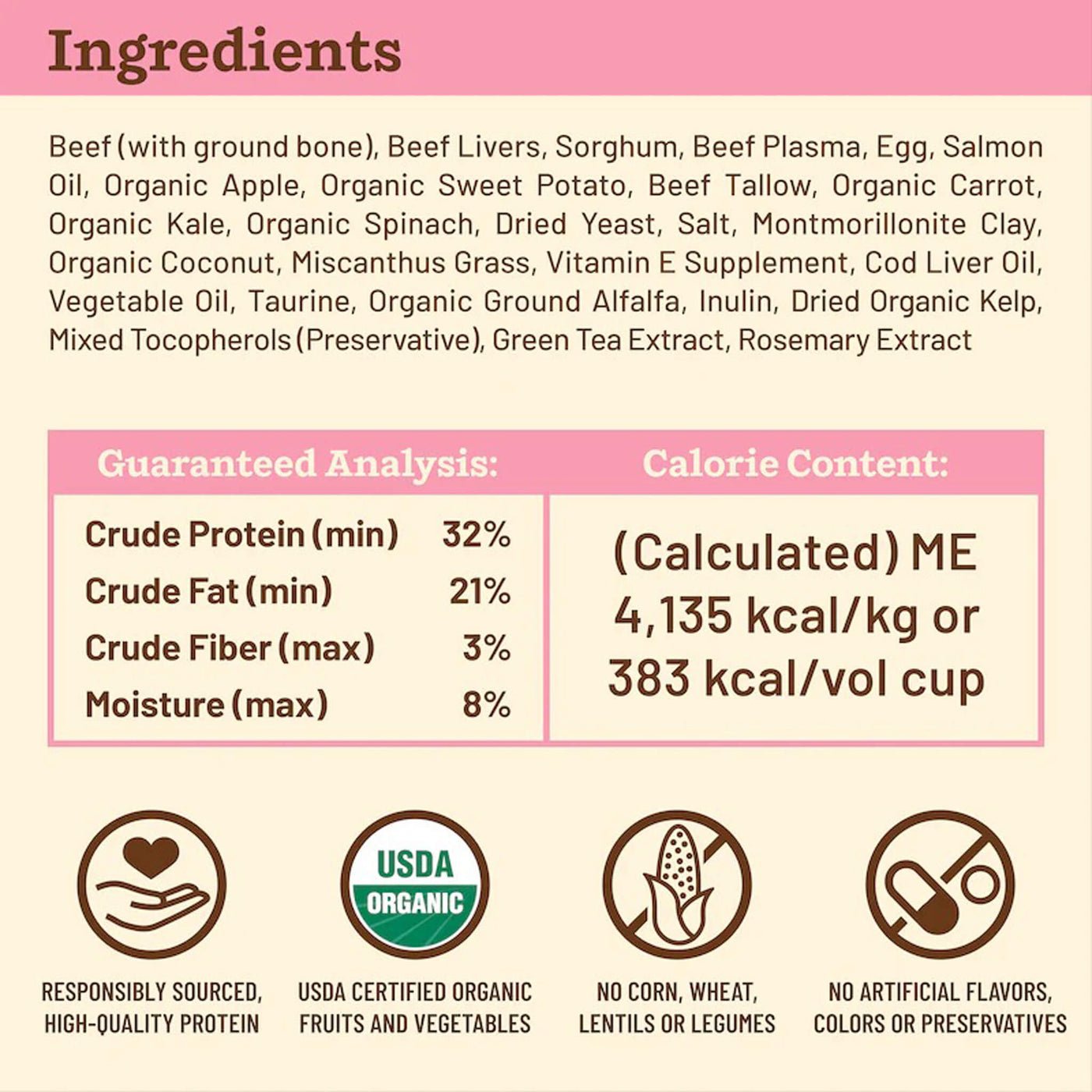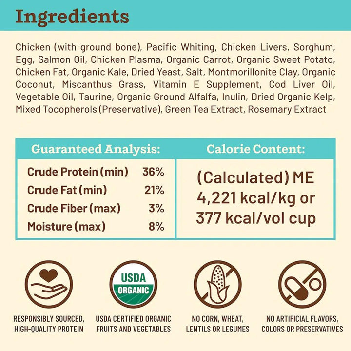 INGREDIENTS: Chicken (with ground bone), chicken livers, sorghum, egg, salmon oil, chicken plasma, organic carrot, organic sweet potato, chicken fat, organic kale, organic apple, dried yeast, salt, montmorillonite clay, organic coconut, miscanthus grass, vitamin E supplement, cod liver oil, vegetable oil, taurine, organic ground alfalfa, inulin, dried organic kelp, mixed tocopherols (preservative), green tea extract, rosemary extract