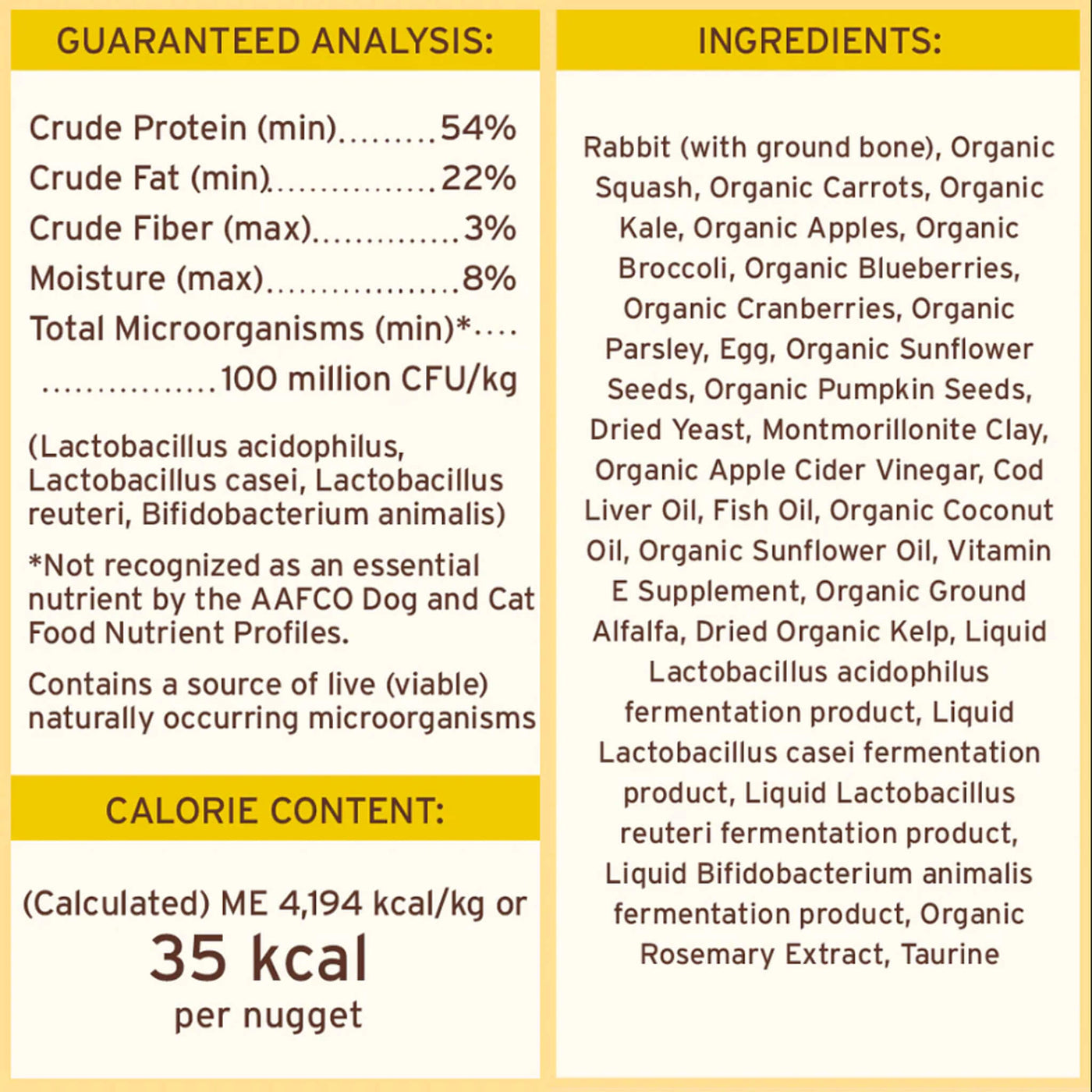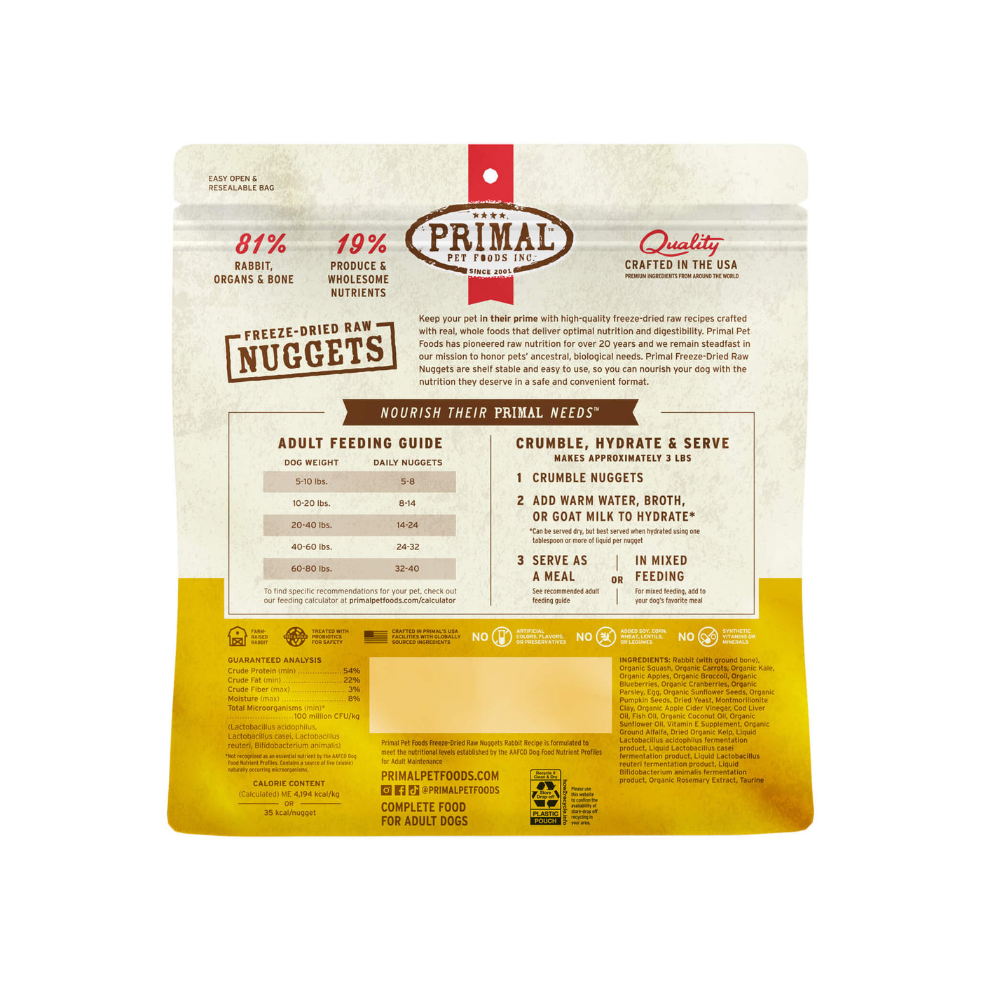 Primal Pet Foods Freeze-Dried Nuggets Dog Food are produced using only the freshest, human-grade ingredients. Their poultry, meat and game are antibiotic and steroid free without added hormones. Primal Freeze-Dried Nuggets incorporate certified organic produce, certified organic minerals and unrefined vitamins to fortify their complete and balanced diets. All Primal Freeze-Dried Formulas contain fresh ground bone for calcium supplementation. This combination of ingredients offers optimum levels of the amino acids (protein), essential fatty acids, natural-occurring enzymes, and necessary vitamins & minerals that are the building blocks for your pet's healthy biological functions.