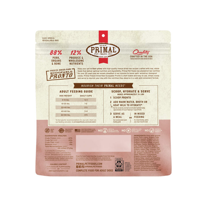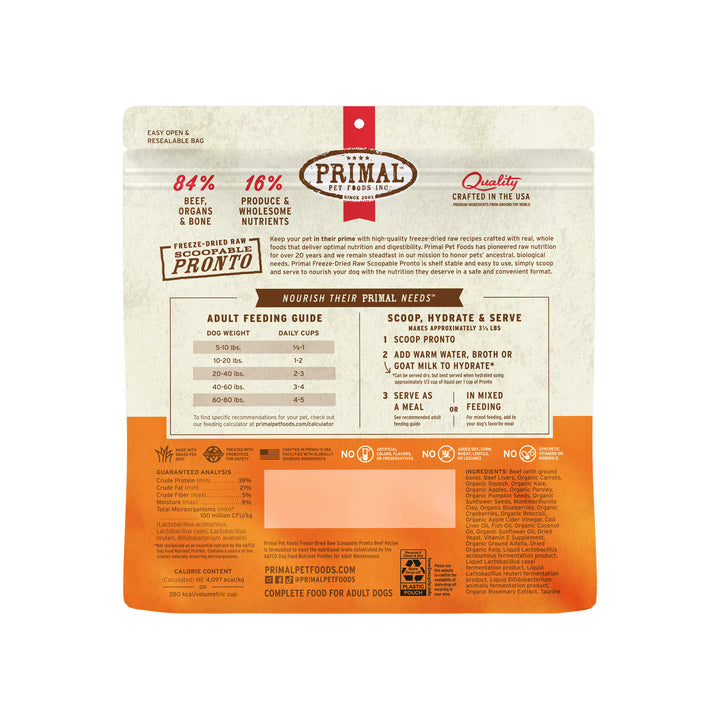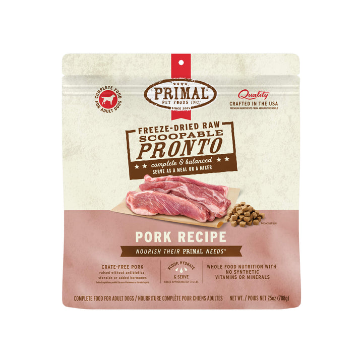 Primal Pet Foods Pronto Freeze-Dried Raw Dog Food is a complete and balanced dog food with real whole food nutrition with no synthetic vitamins or minerals. This freeze dried raw dog food is highly digestible, which supports maximum nutrient absorption. Primal Pronto is a great way to give your dog the raw experience while being shelf stable.