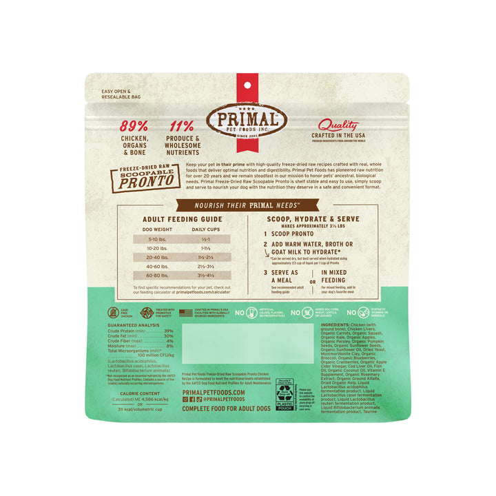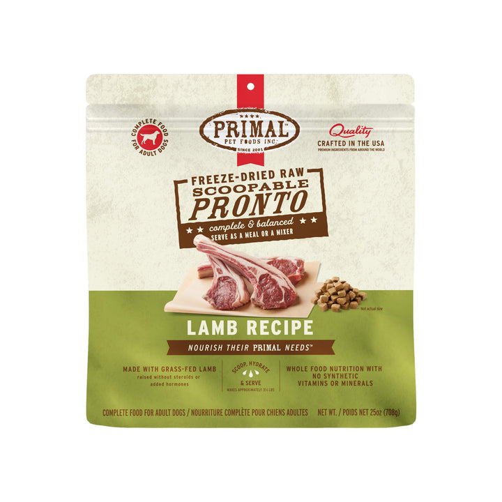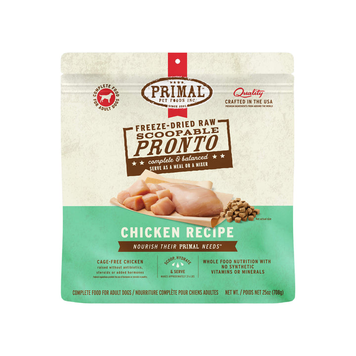 Give your dog the benefits of a raw diet in a fast, convenient format with Primal Pronto Freeze-Dried. Crafted in the USA with ethically raised proteins and organic produce, this dog food without synthetic vitamins provides only real, whole-food nutrition with naturally occurring nutrients. Designed for maximum digestibility and nutrient absorption, Pronto makes raw feeding simple with its easy-to-rehydrate formula that pairs perfectly with water, goat’s milk, or bone broth. Explore the full selection of Primal Dog Food and give your pup a wholesome, natural diet.