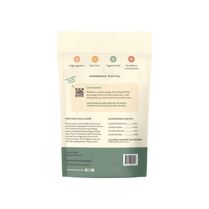 Purposeful Pup Duck Feet Dog Treats are naturally flavorful, slow cooked crunchy duck feet for dogs that provide a satisfying chew and essential nutrients. Each treat is gently prepared to preserve the natural texture and taste your dog loves while promoting dental health.