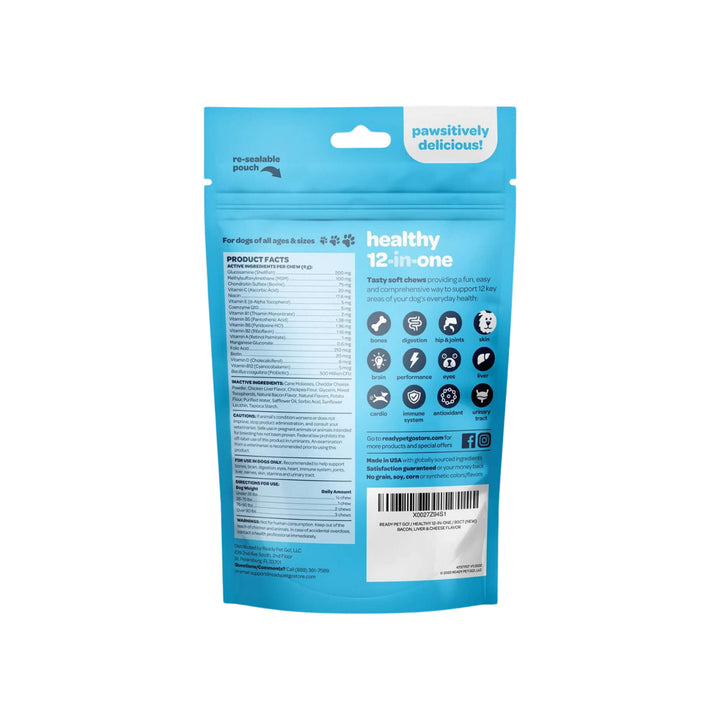 Ready Pet Go! Healthy 12-in-1 Multivitamin Supplement for Dogs delivers a complete blend of essential nutrients to help your pup thrive. These daily vitamins for dogs support joint health, skin and coat condition, digestion, and immune function in one convenient chew.