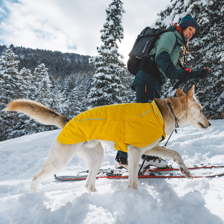 RuffWear Vert Jacket for Dogs features extended, waterproof coverage over the hips and thighs and recycled, lofted insulation that packs exceptional warmth. Leg loops keep the jacket in place when the winds kick up, and the leash portal allows the Vert to be worn over a harness.