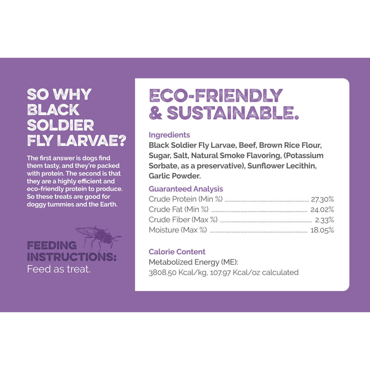 Eco-friendly and delicious, Scout & Zoe's Super Fly Jerky Dog Treats provide clean nutrition without artificial additives or fillers. These insect protein dog treats support your dog’s health while also reducing environmental impact through sustainable sourcing.