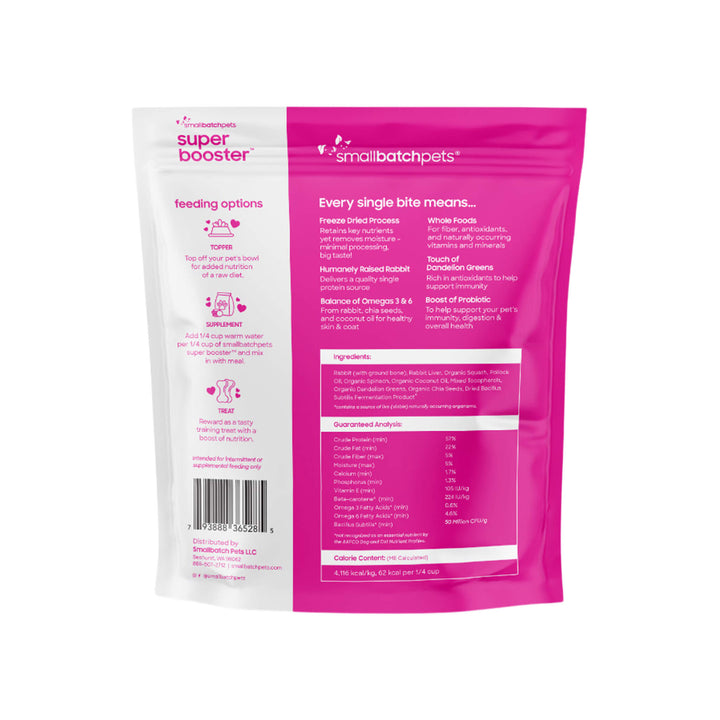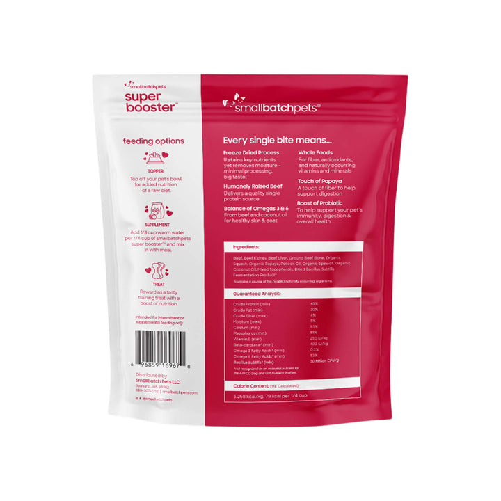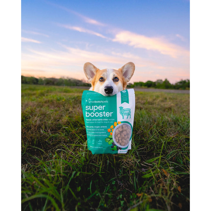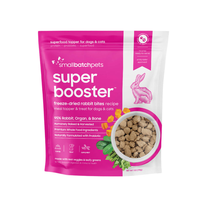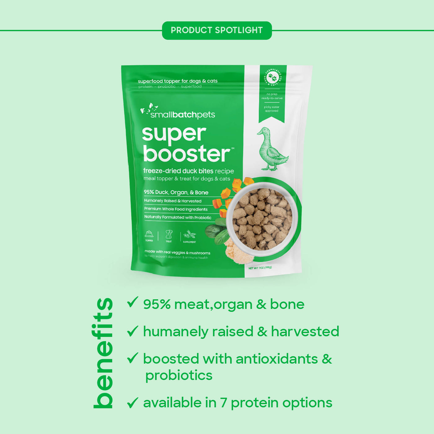 SmallBatch Freeze Dried Super Booster Bites are single protein freeze dried treats featuring 95% meat, organ and bone. Coming in 7 different proteins, each flavor highlights a different superfood and includes bacillus subtilis, a natural probiotic!