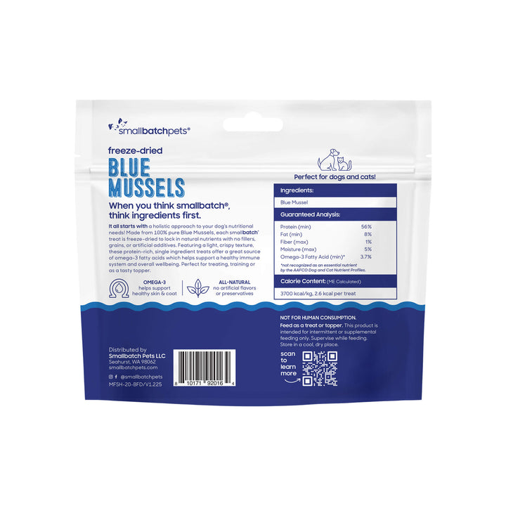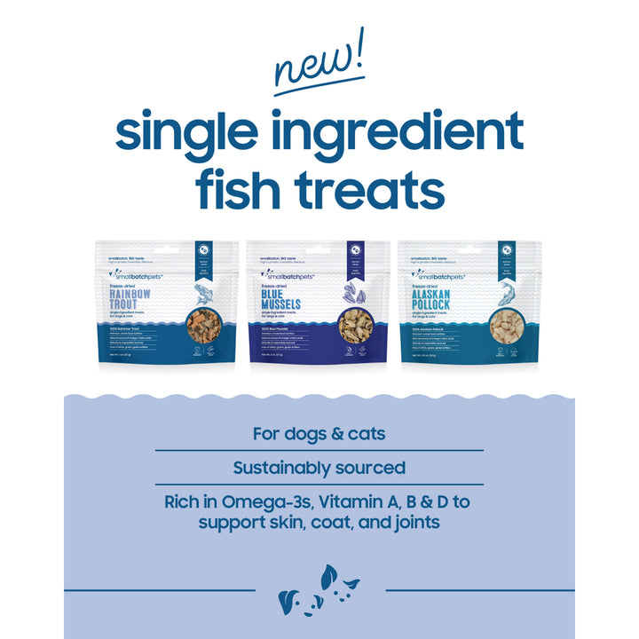 Made from wild-caught fish, these freeze-dried snacks deliver clean, species-appropriate nutrition. Each variety—Alaskan pollock, rainbow trout, or blue mussels—is a natural fit for pets with sensitivities and those needing single ingredient dog treats & cat treats that align with limited ingredient diets.