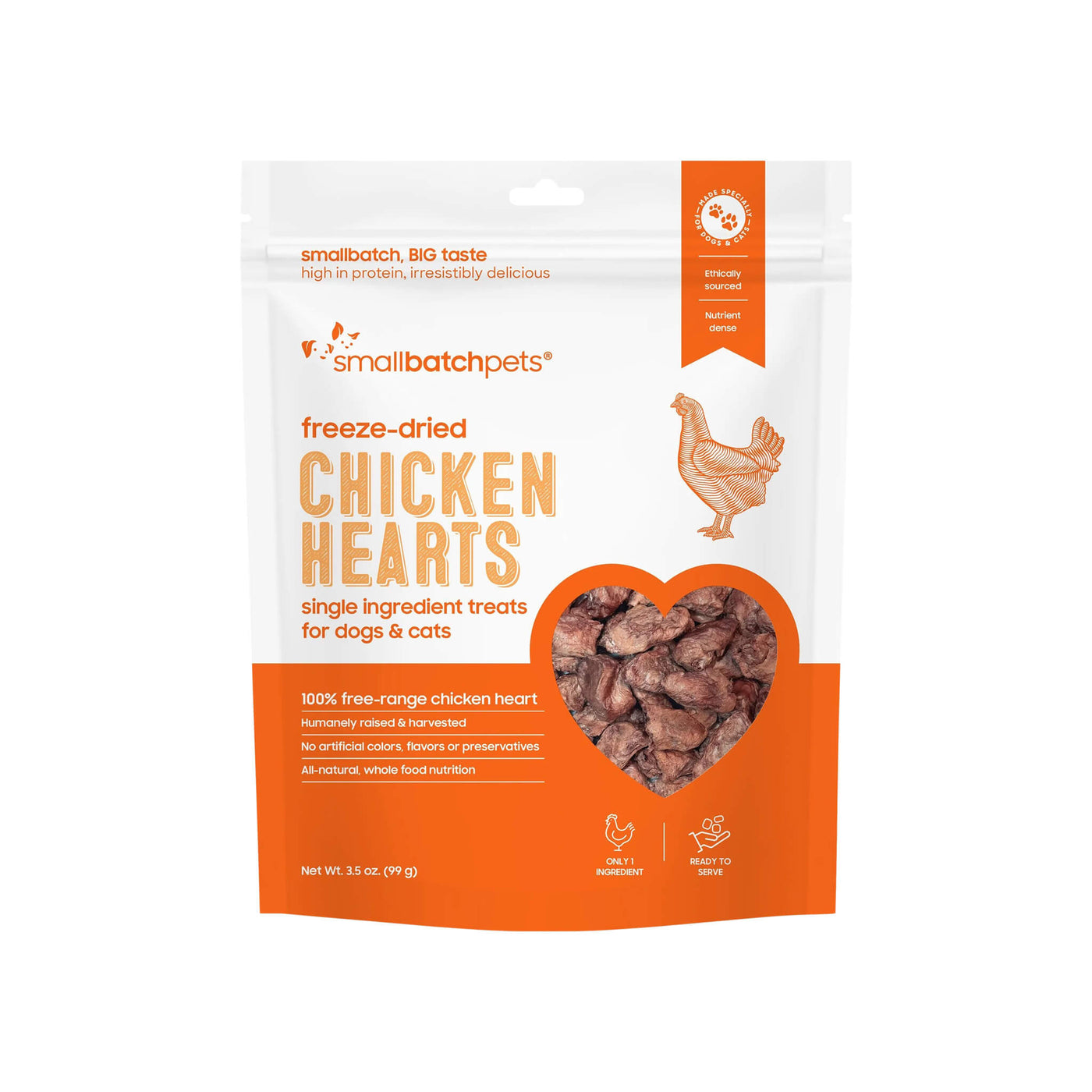 Show your pet some love with SmallBatch Freeze Dried Heart Treats! A treat straight from the heart, literally! These crunchy freeze dried treats feature just one single ingredient- heart! SmallBatch Freeze Dried Heart Treats are a supreme bite of protein made with just one single ingredient making them great for pets with allergies.