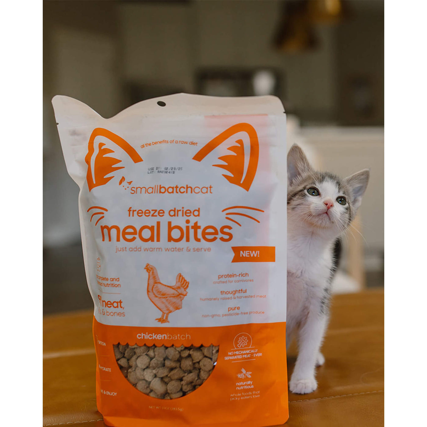 Resembling the natural prey cats crave, SmallBatch Freeze Dried Meal Bites diet provides the essential, natural nutrition necessary for your cat's health and wellness. Cats look and feel great when fed SmallBatch nutritionally balanced raw diet entrees, while maintaining top body condition and building a foundation for a proactive health program.