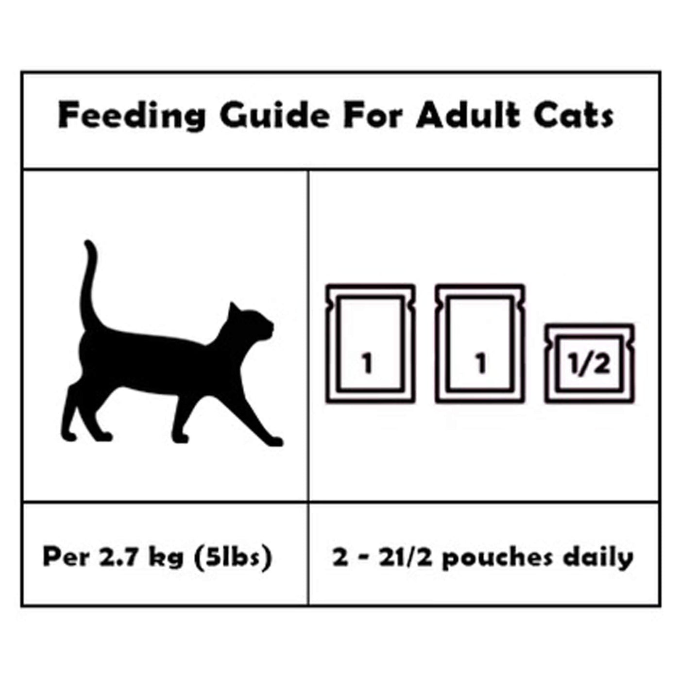 Per 5 lbs (2.7 kg)…….. 2–2.5 pouches daily