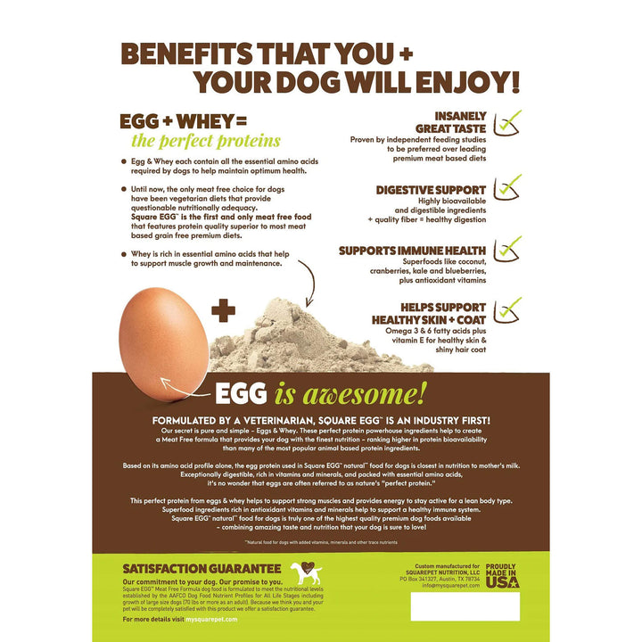 Feed Square Pet Square Egg Meat Alternative Dry Dog Food as a dependable, meat-free option made with eggs and whey for everyday nutrition.
