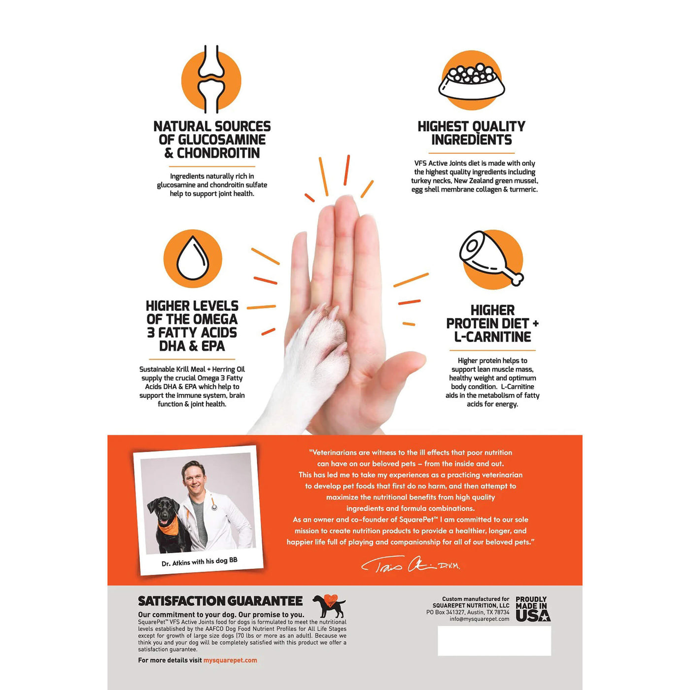 Square Pet VFS Active Joints Dry Dog Food is formulated as a complete and balanced diet with nutrients selected to help maintain joint function. This joint support dog food with glucosamine & chondroitin incorporates its mobility-focused ingredients directly into the full recipe to support long-term nutritional planning.