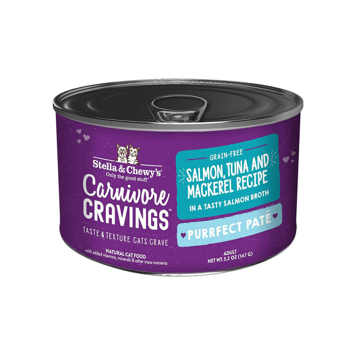 Stella and Chewy's Carnivore Cravings Purrfect Pate Salmon, Tuna and Mackerel Wet Cat Food is a smooth pate in a tasty salmon broth. Approved by picky cats, this wet cat food is rich in animal protein and low in carbs with added taurine to support overall heart health.
