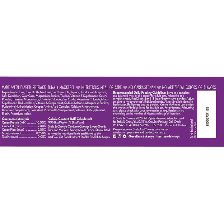 Stella and Chewy's Carnivore Cravings Savory Shreds Tuna and Mackerel Wet Cat Food is made from responsibly sourced, wild-caught tuna and mackerel and there are never any added hormones or antibiotics. Your cat is sure to love the texture as it is made from real shredded muscle meat.