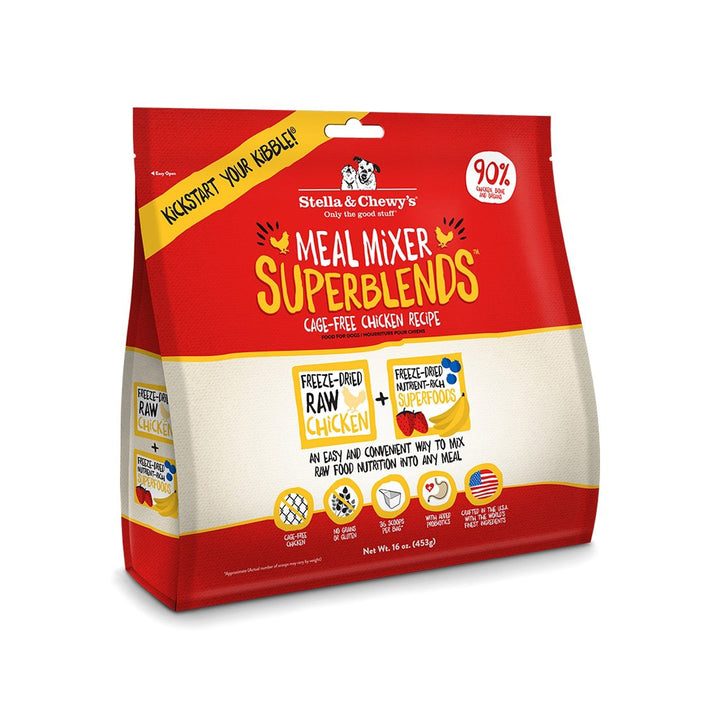Packed with pure proteins and organic fruits and vegetables, Stella & Chewy's Superblends kickstarts kibble, making for a tasty topper with real, raw nutrition.Add a tasty topper to your dog's kibble with Stella & Chewy's Superblends Meal Mixer.