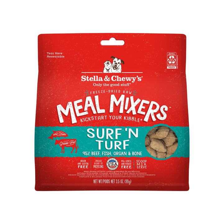 Using Stella & Chewy's renowned quality, Stella & Chewy's Freeze-Dried Meal Mixers are grain-free, gluten-free morsels that feature all of the benefits of a raw food, including protein packed meat and nutrient rich organs and bone. Every meat source is of the highest quality: the beef is grass-fed, the poultry is cage free, and the fish are wild caught.