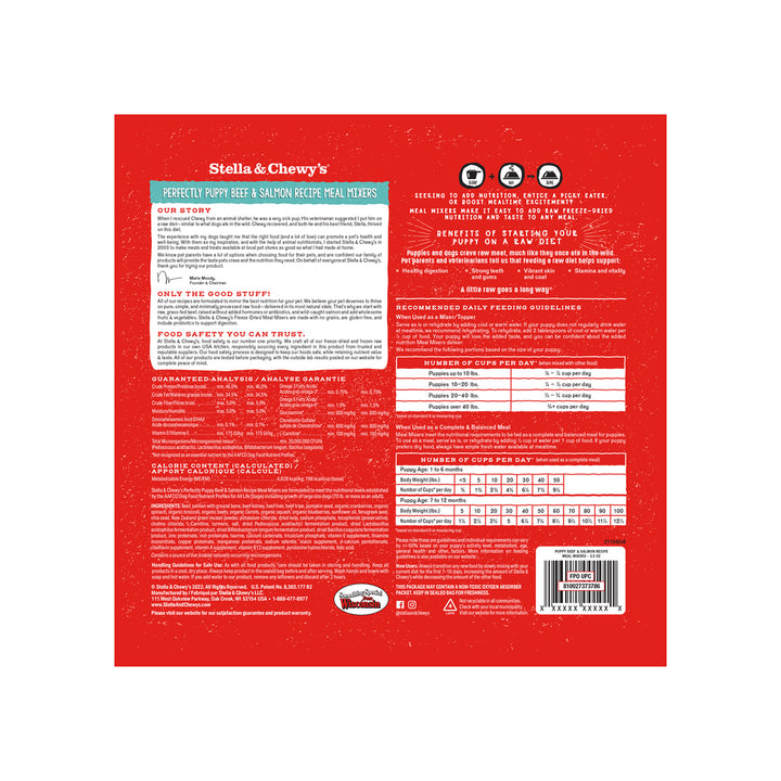 Complete well-being: essential vitamins and minerals tailored for health. Smaller morsels cater to tiny muzzles. Elevate mealtime with Stella & Chewy's Puppy Meal Mixer Beef & Salmon. Watch them thrive and savor each bite. Gift your pup wellness and happiness with Perfectly Puppy Beef & Salmon Mixers.