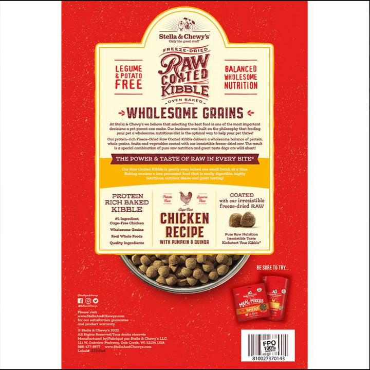 Stella & Chewy's Raw Coated Wholesome Grains Dog Food provides optimal protein, fat, and calories for growing pets, with added DHA to support brain and eye development. Gently oven-baked for a less processed dry food, it includes wholesome grains like oatmeal, pearled barley, and quinoa. Responsibly sourced and free from added hormones or antibiotics, this food offers the convenience of adding raw nutrition to your pet’s diet. We proudly stand by our product with a Satisfaction Guarantee, ensuring no artificial preservatives, colorings, corn, wheat, soy, or by-products.