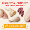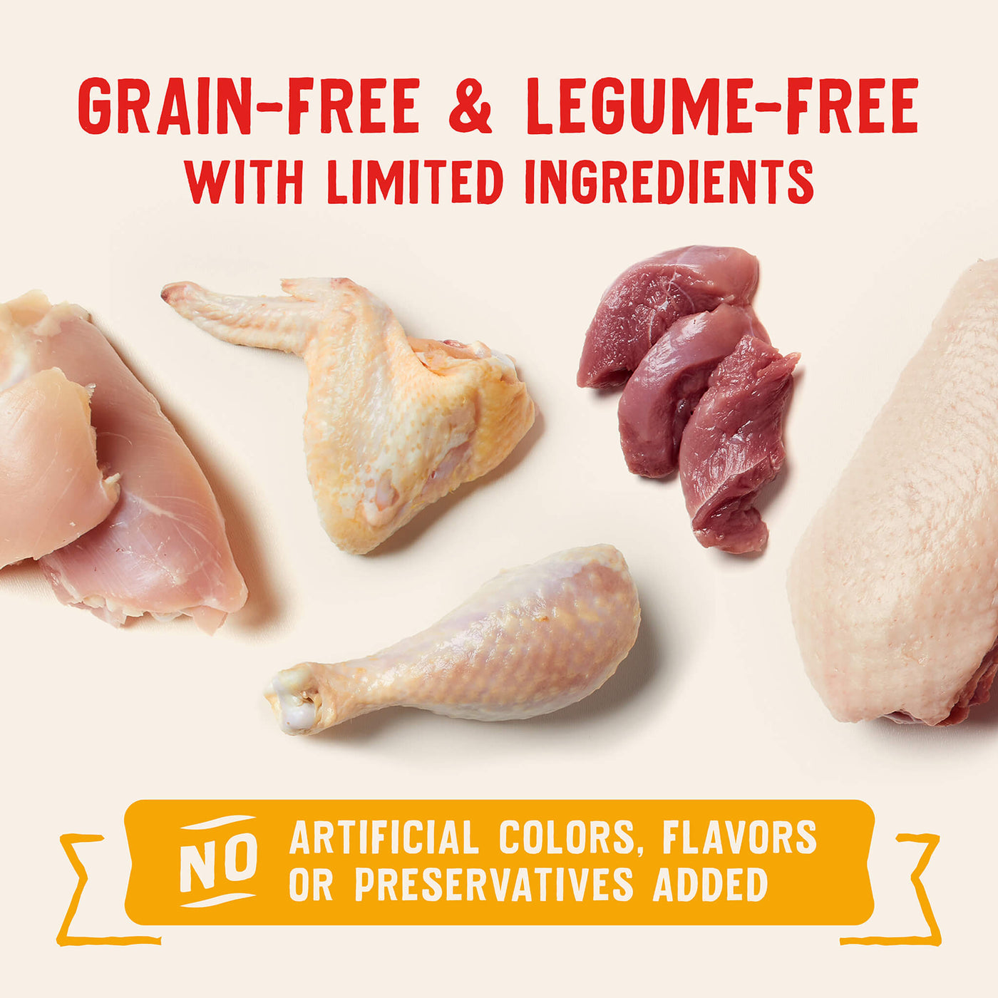 The formula is grain-free and legume-free, with no peas, lentils, artificial colors, flavors, or preservatives added.