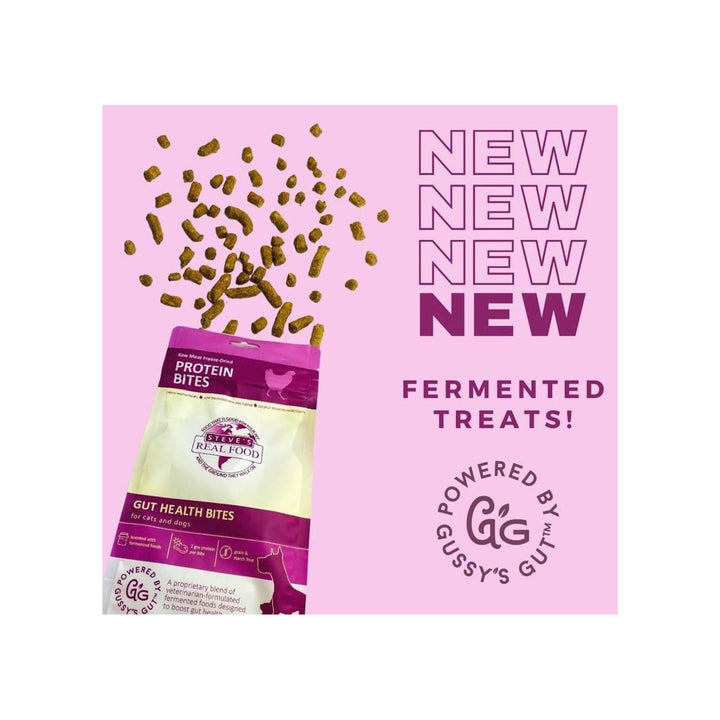 Steve's Real Food Probiotic Protein Bites are a great treat for both dogs and cats. These freeze-dried treats are powered by Gussy’s Gut organic fermented superfood blend, coconut oil, and locally-sourced raw honey. Protein Bites are a healthy and delicious way to add whole living foods to your pet’s diet.