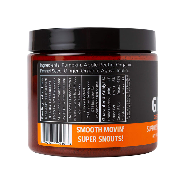 Super Snouts GI Balance Digestive Support is a fiber-rich supplement designed to promote gut health and stool consistency in dogs and cats. Made with pumpkin, apple fiber, and organic agave inulin, this formula helps support digestion, nutrient absorption, and healthy anal glands. Whether used daily or for occasional gastric upset, this easy-to-use powder provides a natural way to maintain a balanced digestive system. Simply sprinkle on your pet’s food to support optimal gut health with Super Snouts GI Balance.