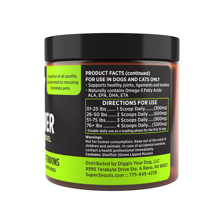 Diggin' Your Dog Super Snouts Joint Powder is a unique joint supplement composed of 100% New Zealand Green Lipped Mussels that have been cold processed and lipid stabilized. This joint supplement for dogs and cats enhances healthy joint fluid viscosity, promotes tissue health, as well as supporting healthy heart, cardiovascular and brain function.
