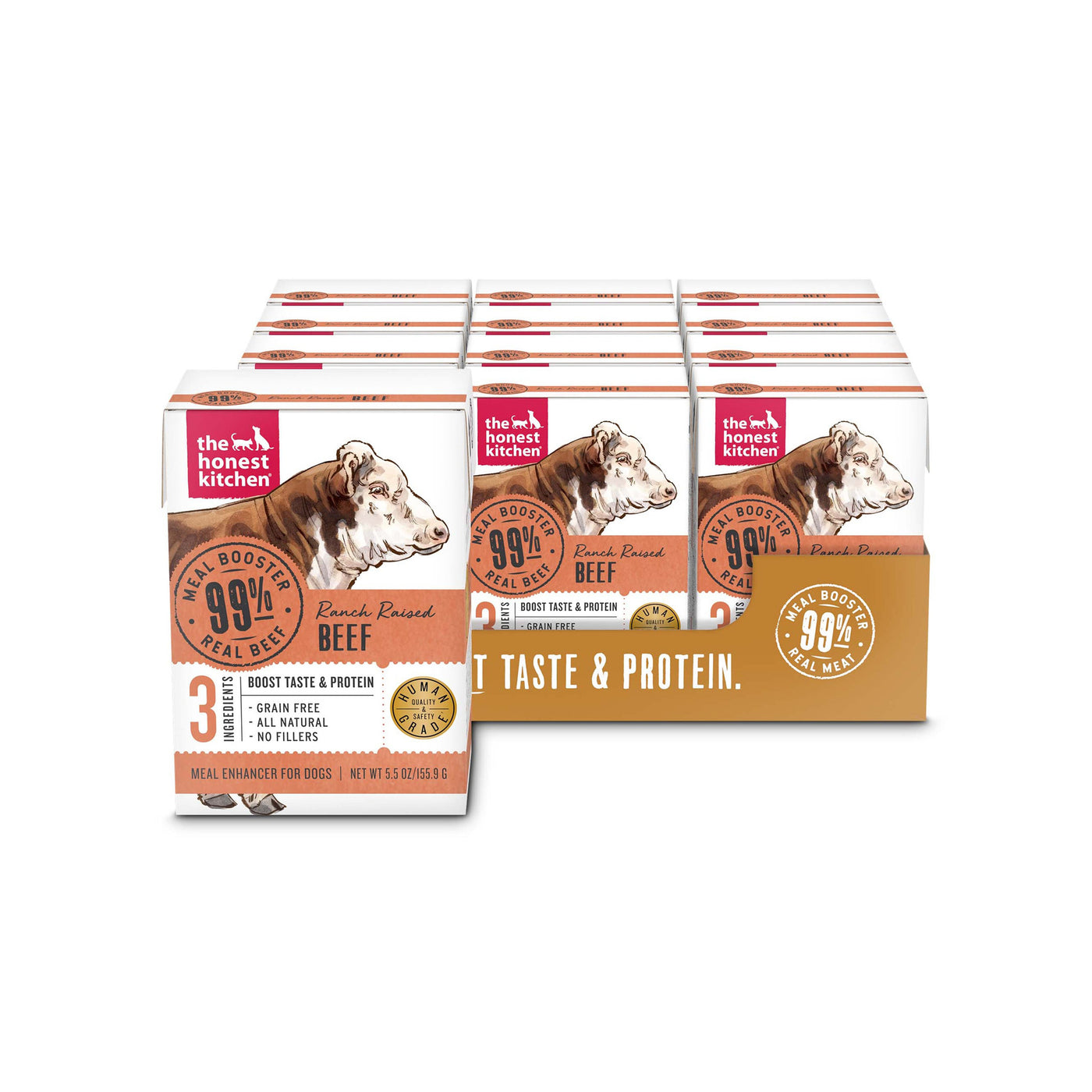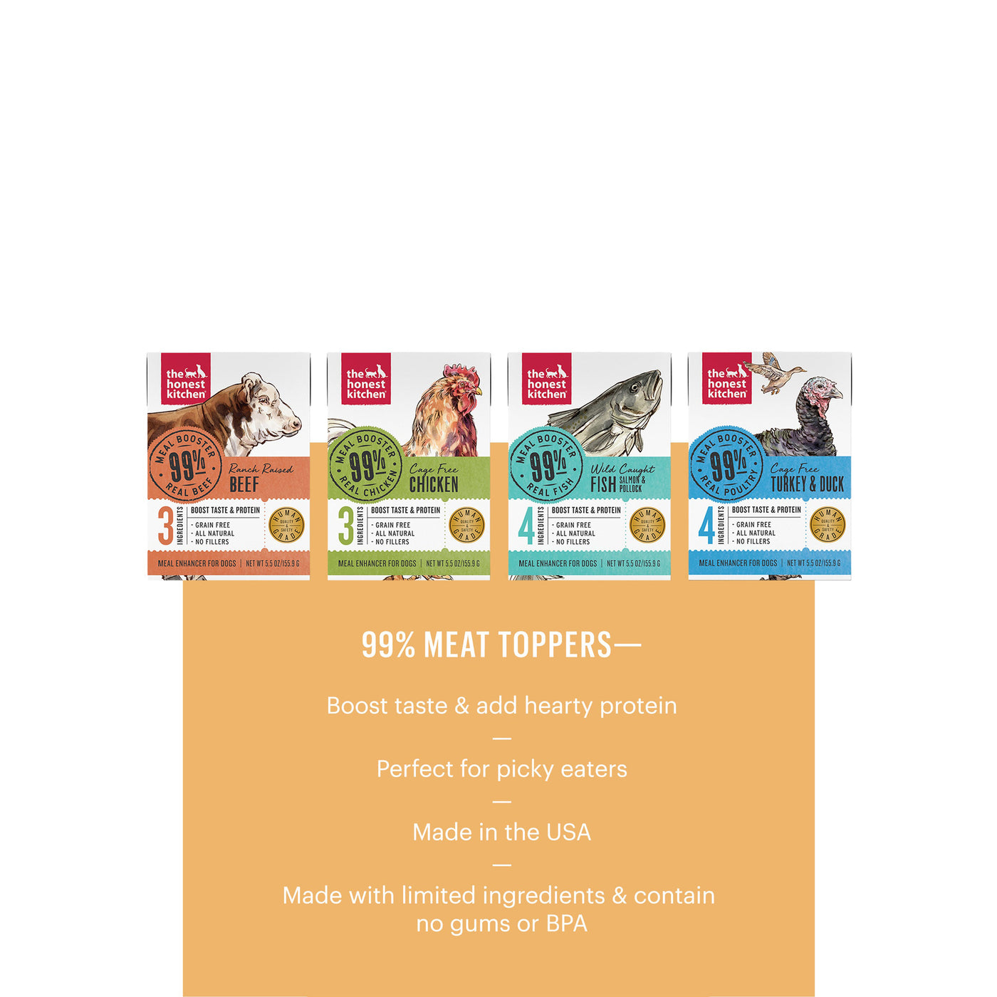 The Honest Kitchen 99% Meat Meal Booster Wet Dog Food is the perfect choice for pet parents looking to elevate their dog’s meals with nutritious, high-quality ingredients. Made with real, human-grade meat and produced in a human food facility, this wet food topper meets the same quality standards you expect for your own food.