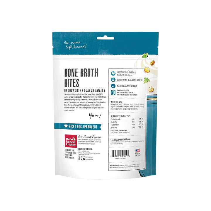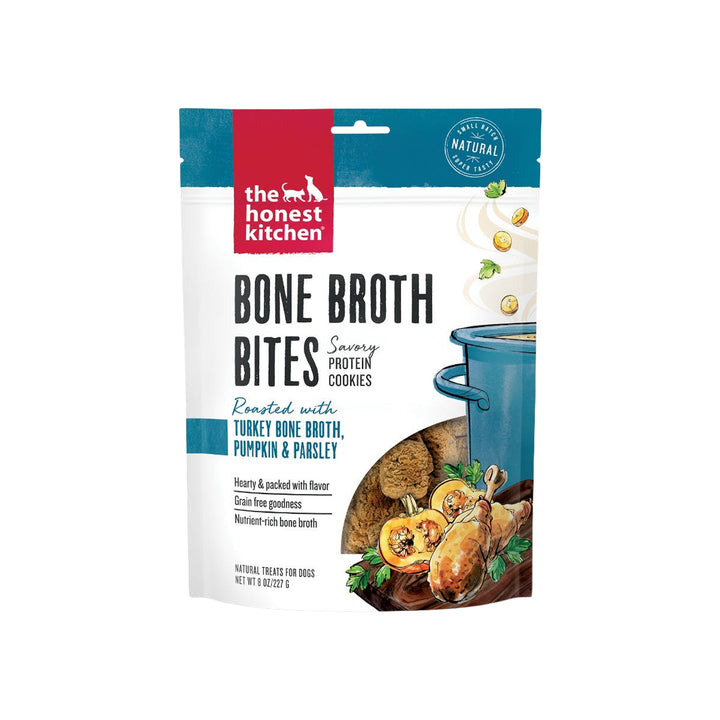 The Honest Kitchen Bone Broth Bites 8 oz Treats for Dogs biscuits combine savory, super tasty bone broth with nutrient-rich pumpkin, carrots, sweet potatoes and a touch of parsley into one healthy bite.