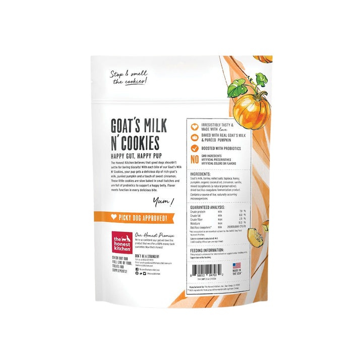The Honest Kitchen believes that good dogs shouldn't settle for boring biscuits! That's why in each Goat's Milk N' Cookies biscuit your pup gets a delicious dip of rich goat’s milk, pureed pumpkin and a touch of sweet cinnamon. Each little cookie is slow baked in small batches and full of probiotics to support a happy belly. Flavor meets function in every bite.