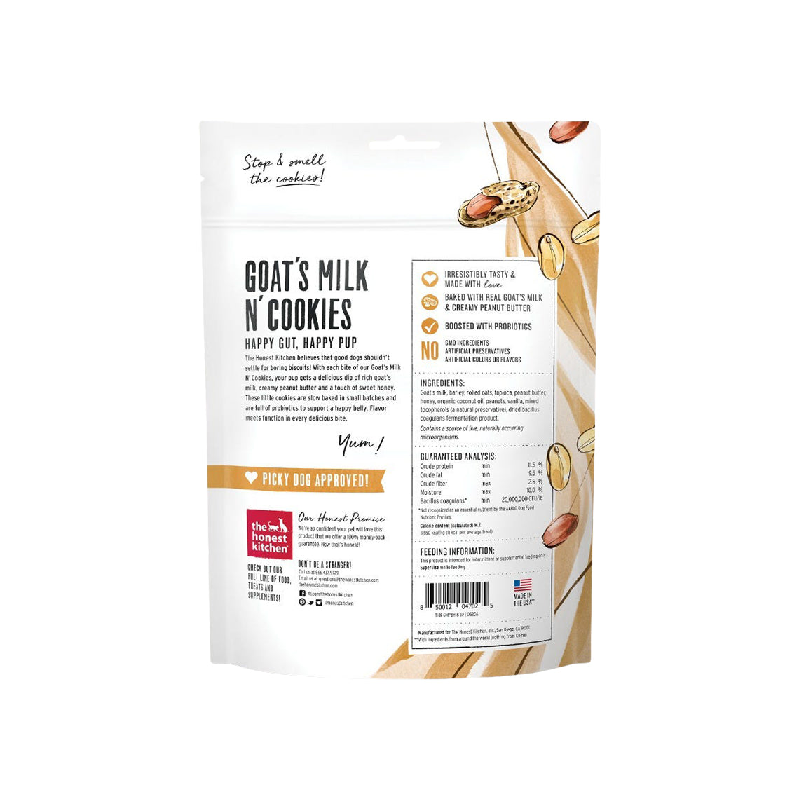 The Honest Kitchen Goat's Milk N' Cookies 8 oz Treats for Dogs contain real goat's milk which is full of probiotics to support a healthy digestion. Flavor meets function in every delicious bite of these healthy, whole grain dog treats