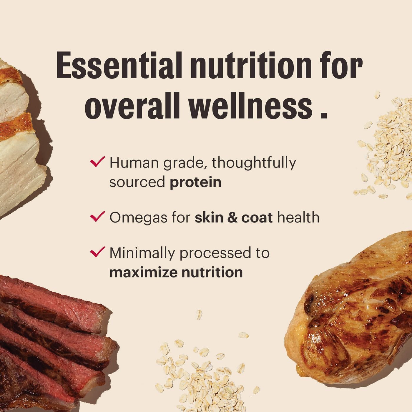 Made with human-grade chicken combined with whole grains like oats and barley, these Essential Clusters are minimally processed for a crunchy, nutrient-rich meal dogs love.