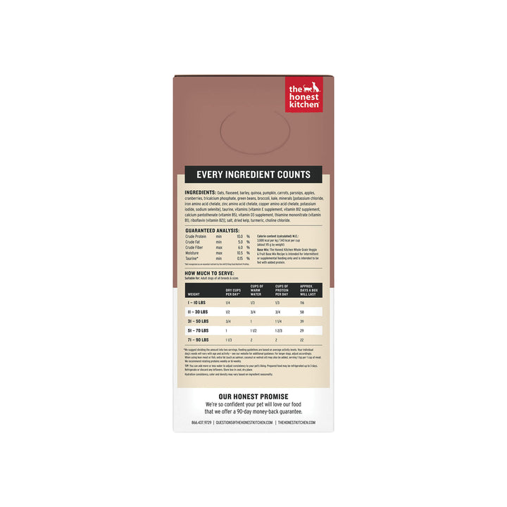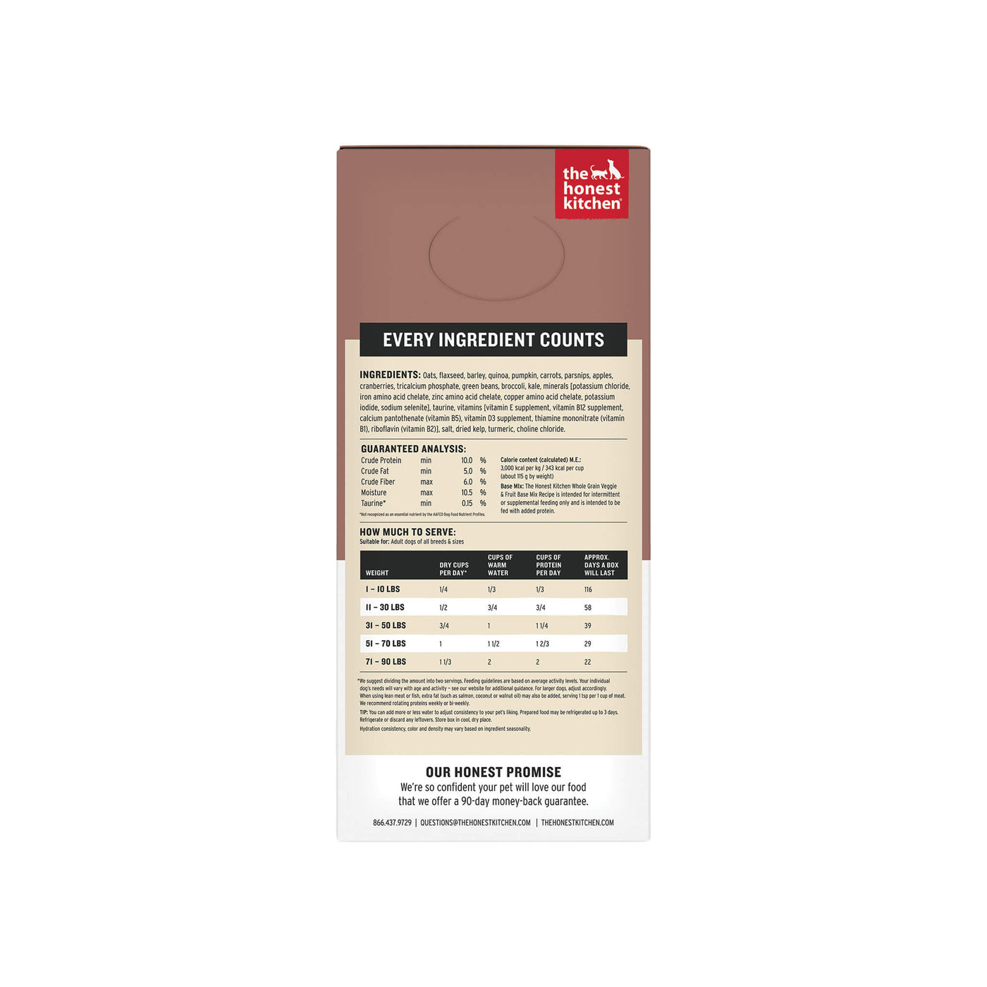 The Honest Kitchen Whole Grain Fruit & Veggie Base Mix Dog Food is a convenient and nutritious solution for pet parents who prioritize premium canine nutrition. Crafted with a whole grain base that rehydrates to four times its weight, this mix is ideal for adult and senior dogs of all breeds and sizes. Designed to be paired with your dog's preferred protein source (sold separately), it accommodates various dietary needs, including protein restrictions, raw diets, allergies, or personal preferences.